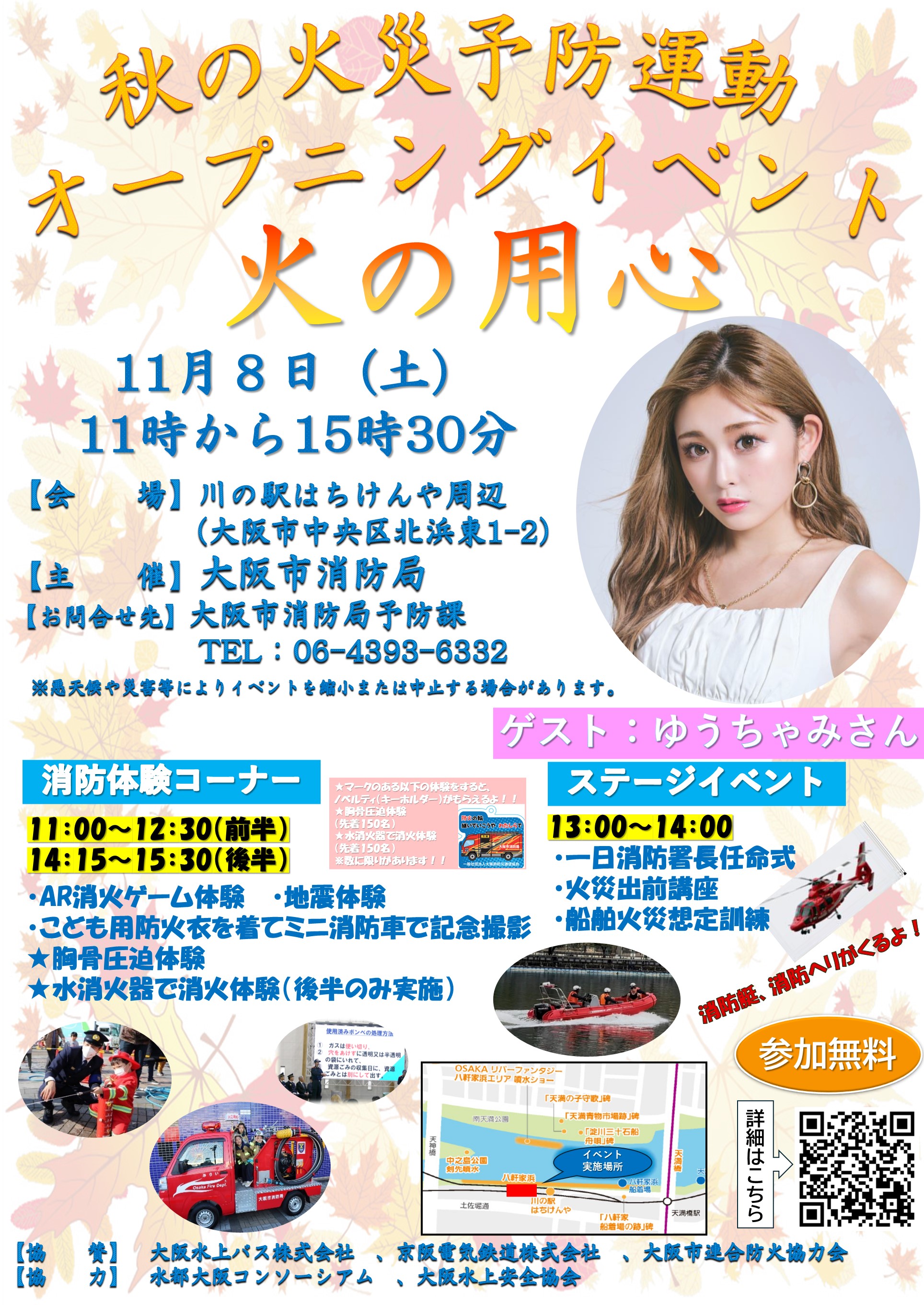 大阪市消防局は、秋の火災予防運動を実施するにあたり、市民の皆さまに火災予防の重要性を再確認していただくため、令和7年11月8日(土曜日)に川の駅はちけんや周辺にて、オープニングイベントを開催します。