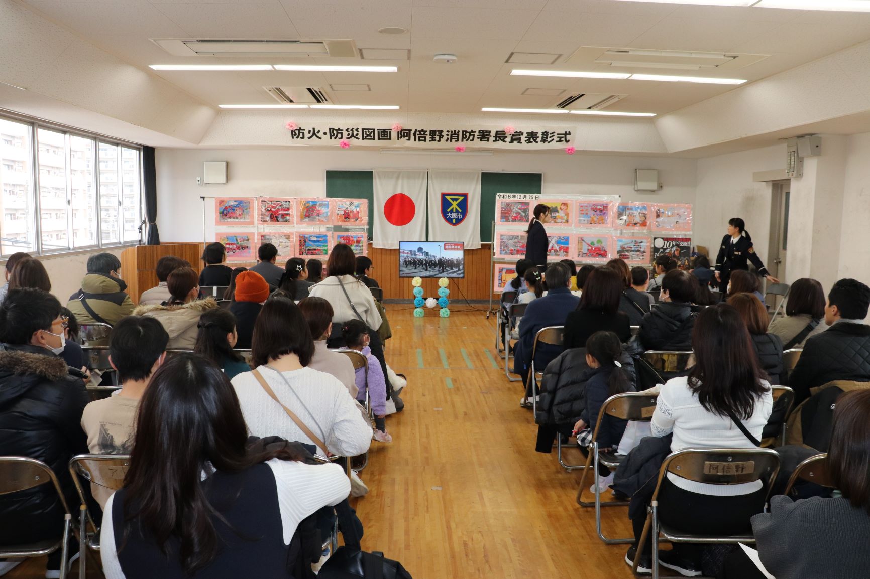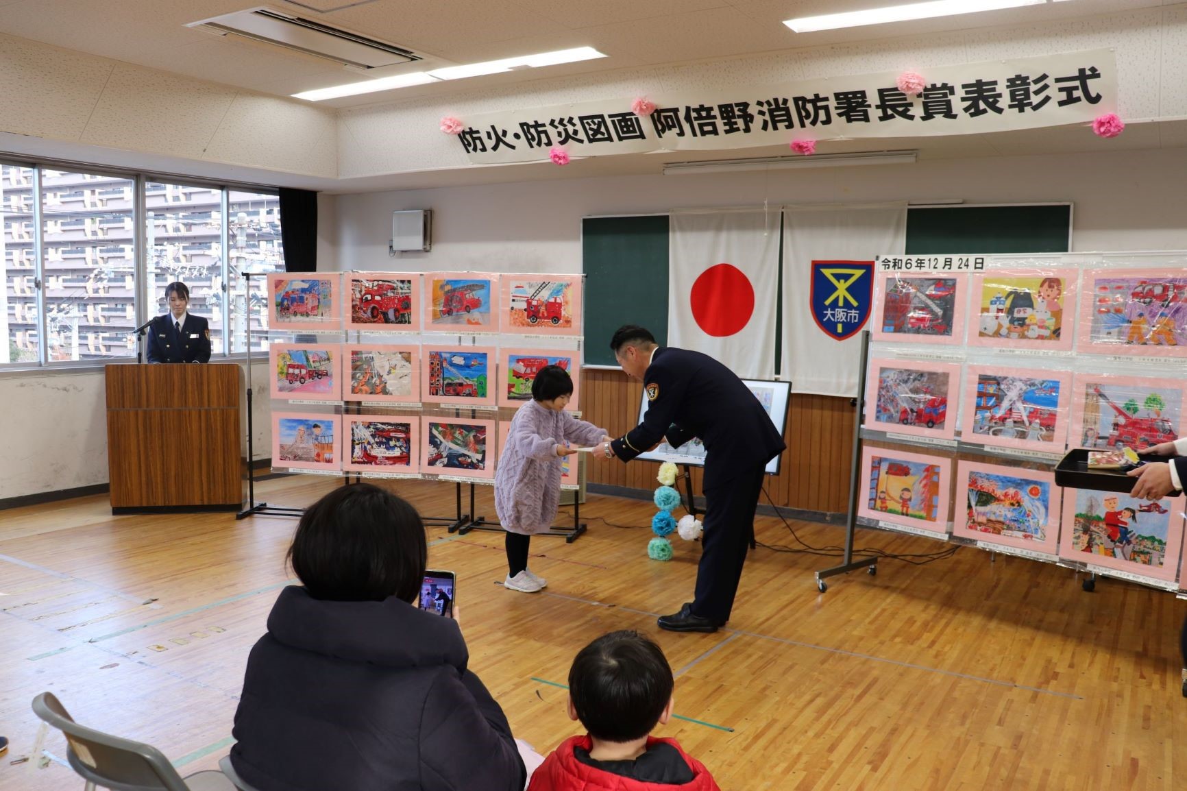 消防局が主催した防火・防災図画展で惜しくも入賞できなかった子どもたちに、今後も防火・防災についての意識を育んで欲しいという思いを込めて阿倍野消防署長から表彰状を授与しました。