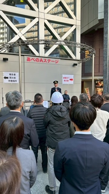消防法では、一定規模以上の建物は防火管理者を定め、消防計画を作成し、その消防計画に基づき消火、避難及び通報訓練を実施しなければなりません。そのような建物が多数存在する阿倍野区のなかで、大阪市南部の玄関口となるターミナル駅が隣接する今回の3ビル同士が連携して自衛消防訓練を実施するという、比較的大きな規模での自衛消防訓練が実施されました。