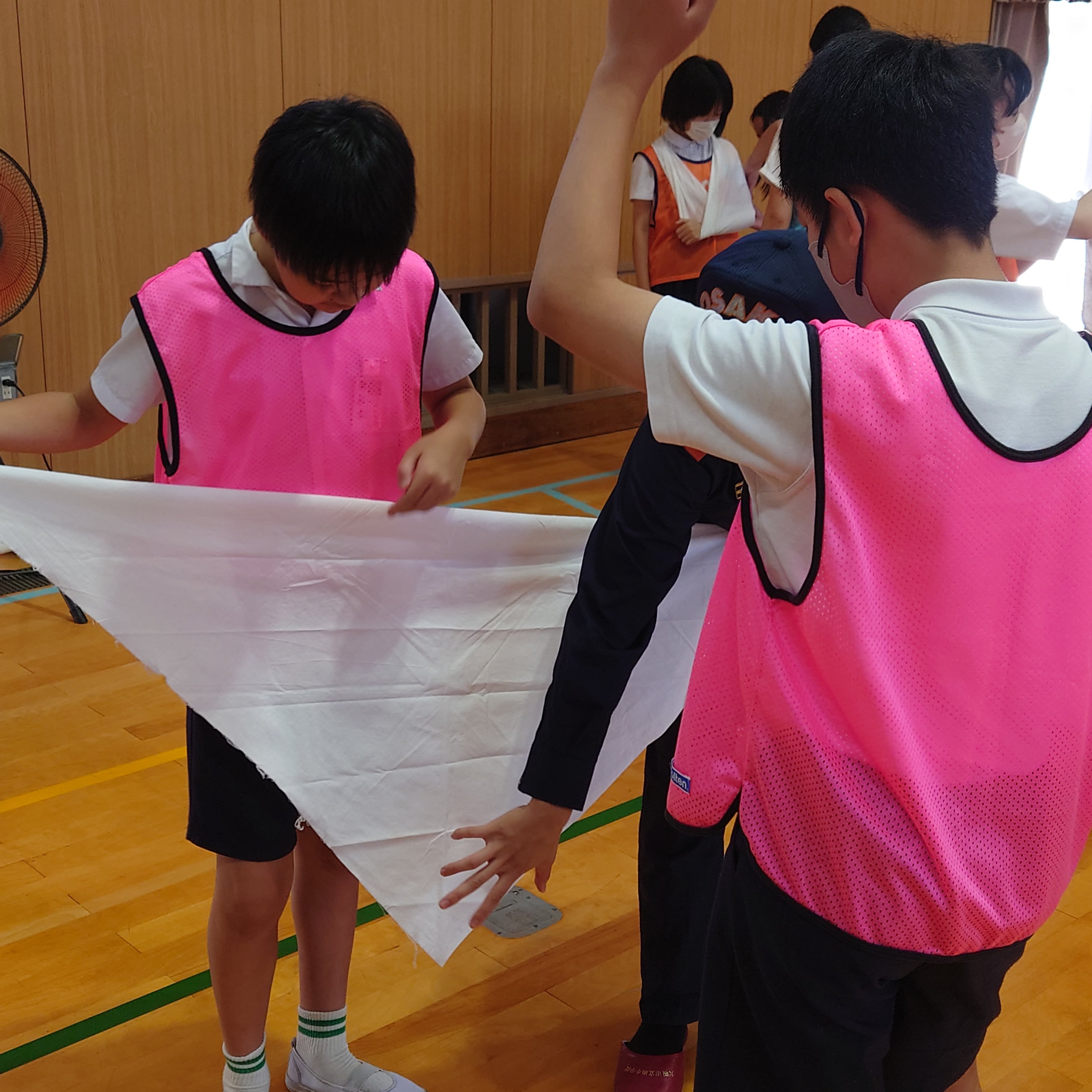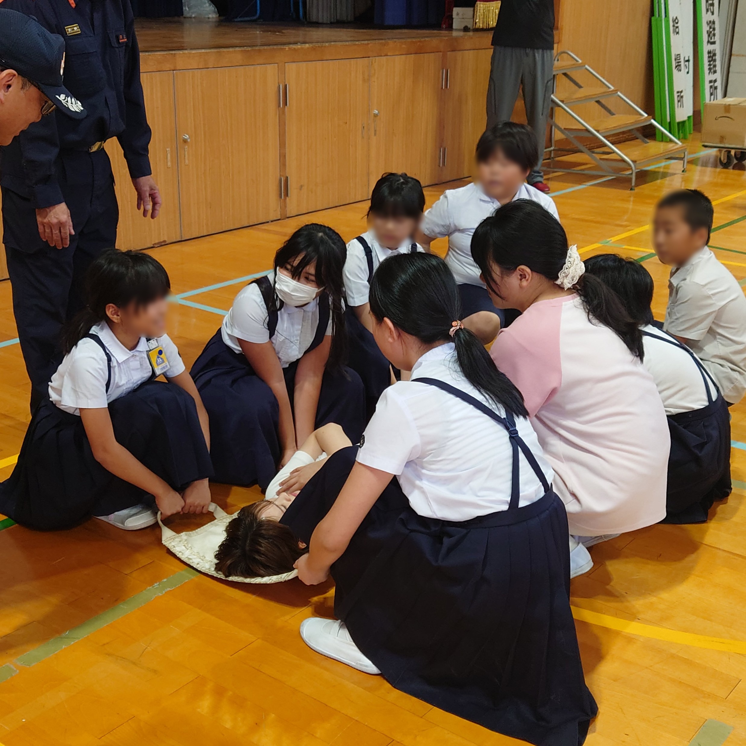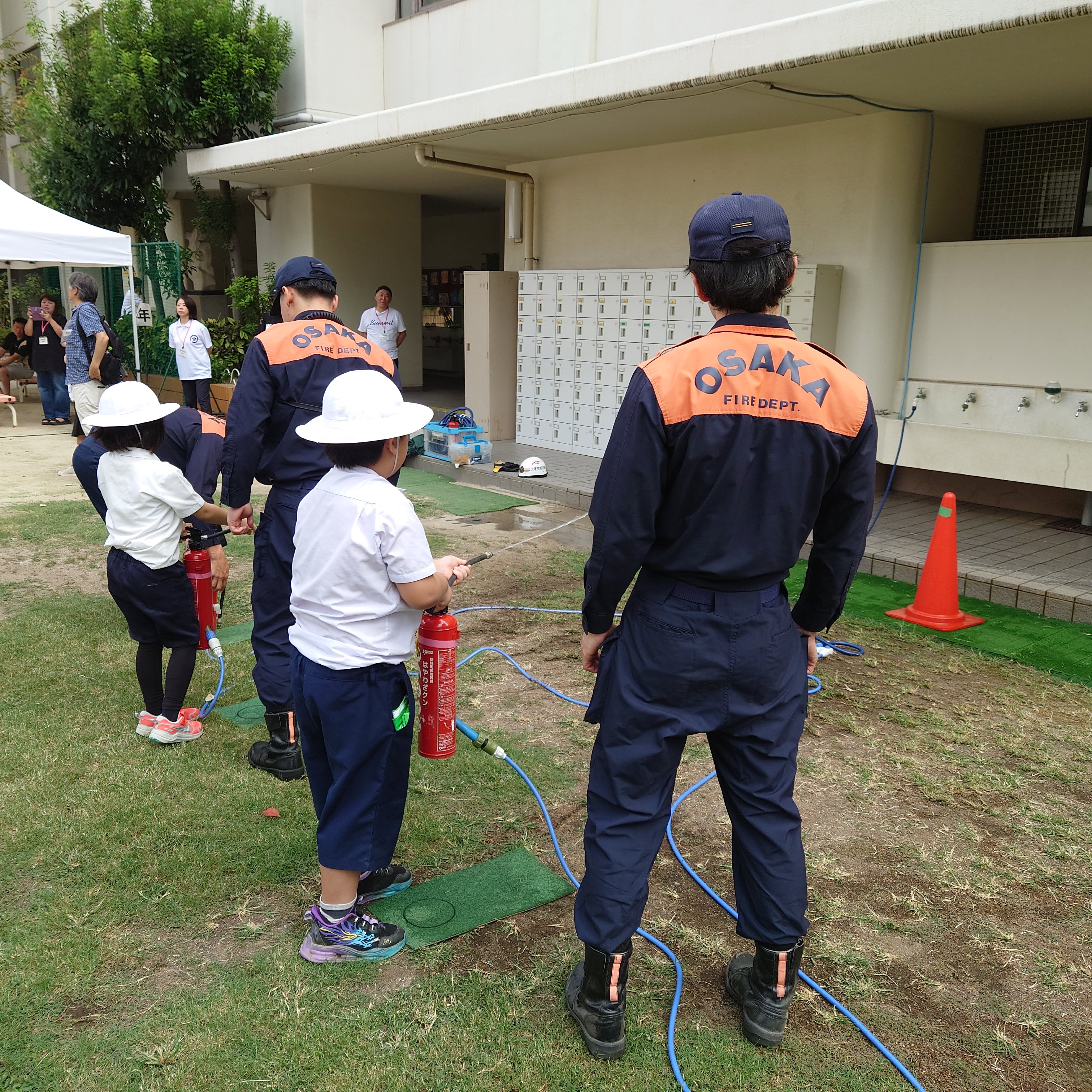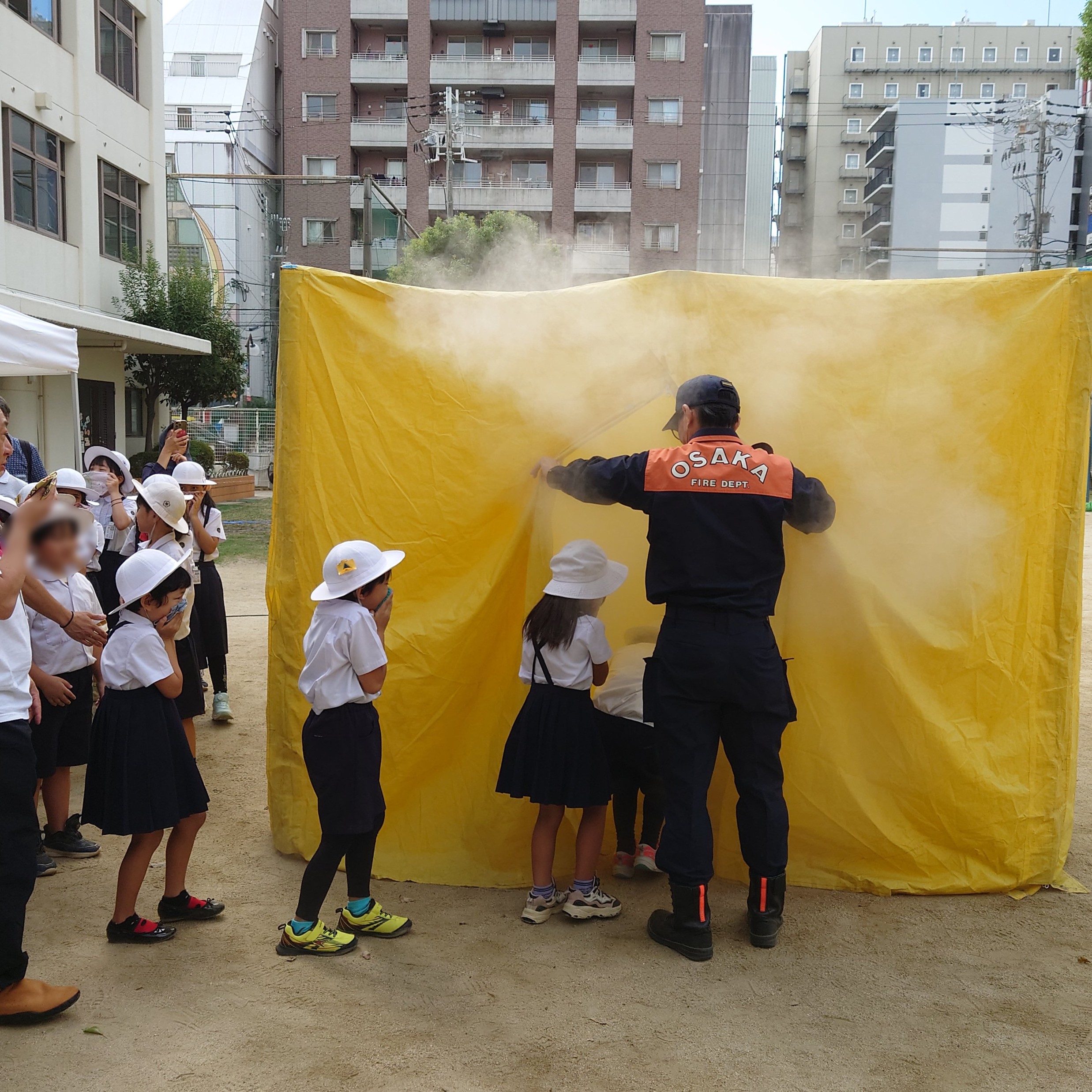 南小学校の1年生から6年生が、担架搬送、三角巾による固定処置、煙中体験、初期消火訓練に熱心に取り組み、大阪の安全を守る未来の担い手の姿に頼もしさを感じました。