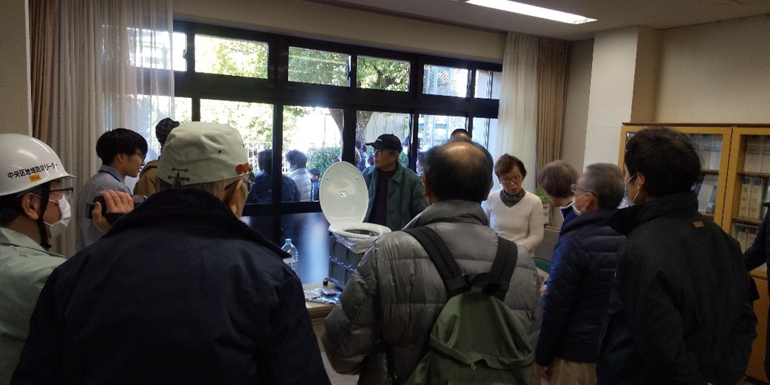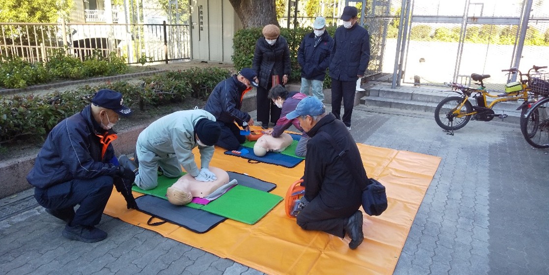 桃谷連合振興町会の役員をはじめ、多くの地域住民の方々が参加され、屋外で寒いなかにもかかわらず、地域防災リーダーが中心となり、AEDの使用を含む心肺蘇生法の実技訓練を実施していただきました。