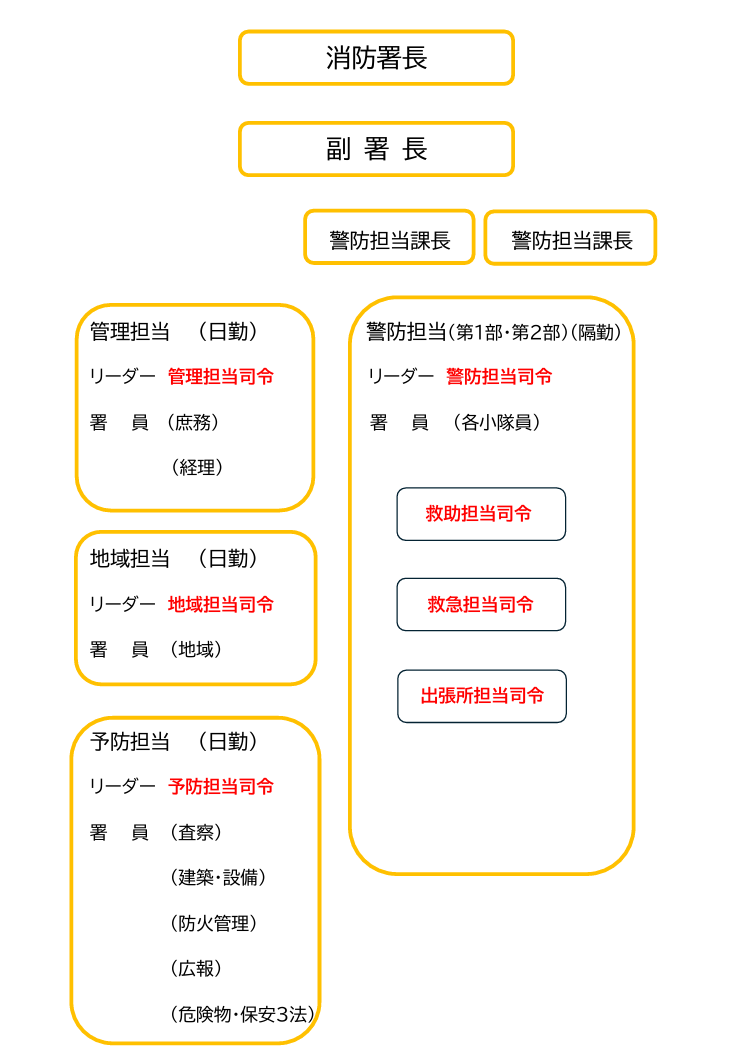 また消防署には、署長、副署長、警防担当課長(2名)、管理担当司令、地域担当司令、予防担当司令、警防担当司令(2名)、救助担当司令(2名)、救急担当司令(2名)、出張所担当司令(4名)、消防司令補以下の階級にある職員、業務職員等が置かれています。