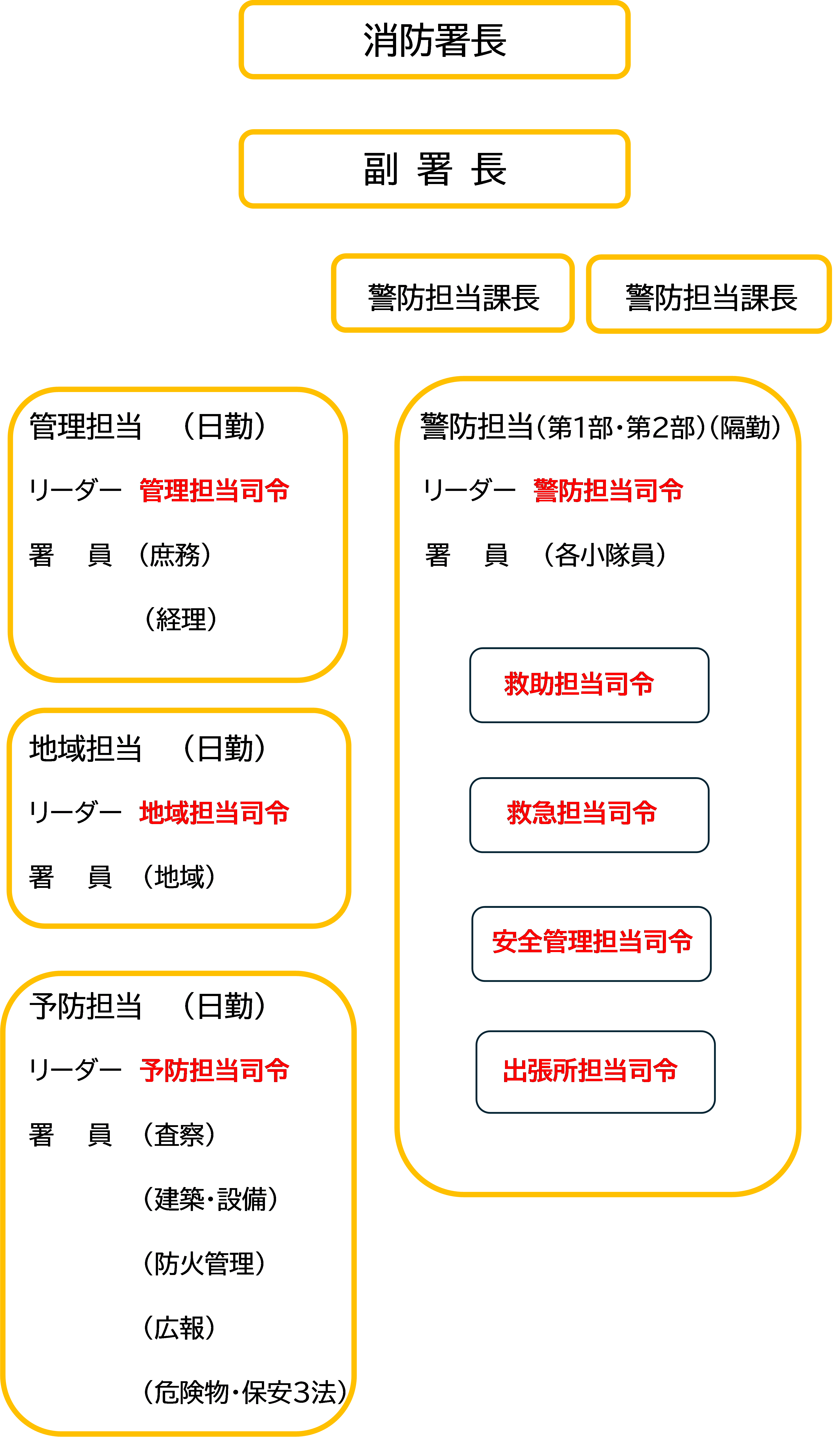 また消防署には、署長、副署長、警防担当課長(2名)、管理担当司令、地域担当司令、予防担当司令、警防担当司令(2名)、救助担当司令(2名)、救急担当司令(2名)、出張所担当司令(4名)、安全管理司令(2名)、消防司令補以下の階級にある職員、業務職員等が置かれています。