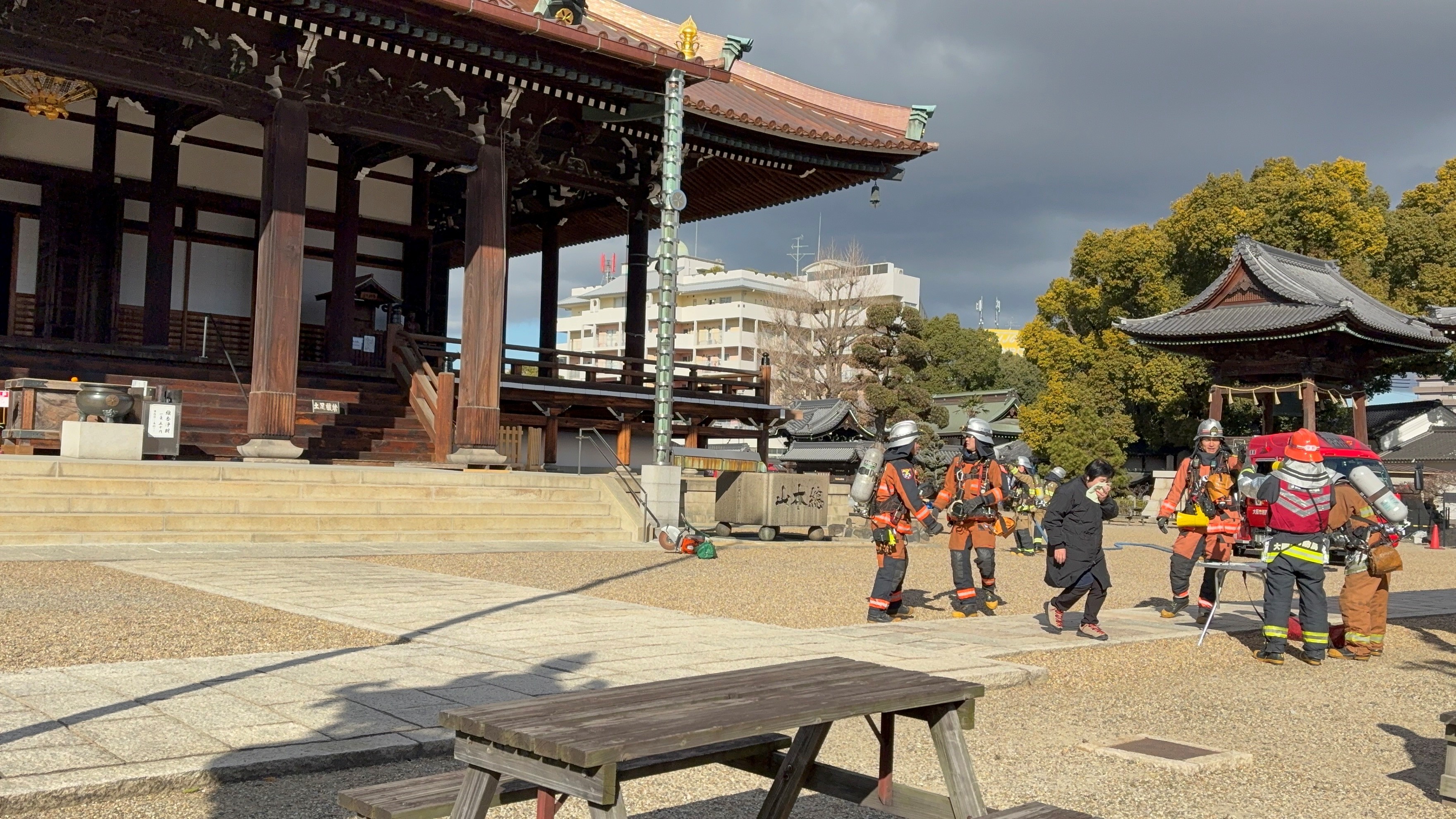 令和8年第72回文化財防火デーに伴い、平野区に所在する大念佛寺様にご協力いただき、合同訓練を実施しました。文化財を火災や災害から守ることを目的に、消火・避難・通報・救命処置訓練を実施し、消防隊及び自衛消防隊による一斉放水を行いました。