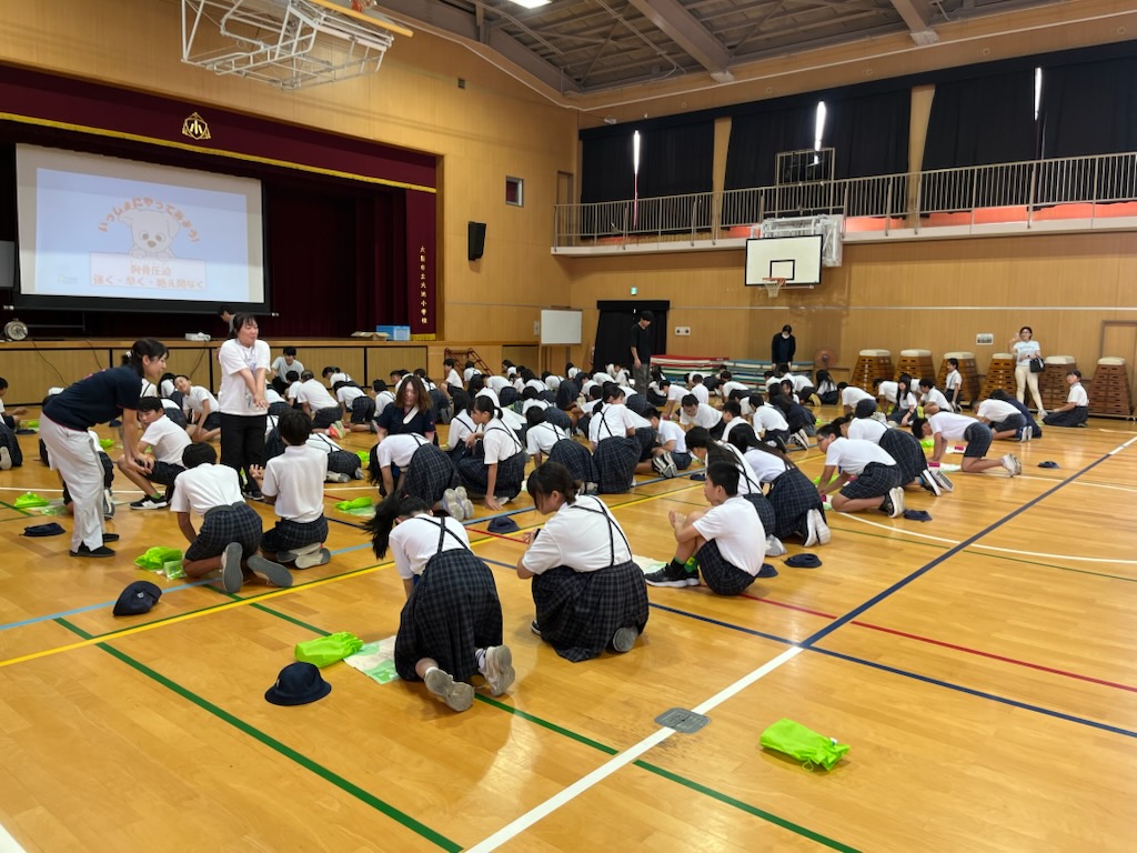 令和7年9月20日(土)に大池小学校において、防災研修(土曜日授業)が実施されました。全学年で避難訓練を実施した後に各学年に分かれて煙中体験訓練、水消火器を使った初期消火訓練、応急処置訓練を実施しました。火事が発生した際の避難方法や消火方法、心肺停止状態の方々への、声のかけ方や胸骨圧迫のやり方、AEDの使用方法等を学びました。児童たちには将来、自分自身の身を守ることはもちろん、困っている人々を助けられるように今日の研修を生かして勇気をもって行動して欲しいと伝えました。