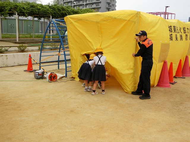 本訓練は、本校に通う児童の皆さんを対象に、鯰江東地域活動協議会の皆さんや小学校、区役所、消防署が協力して、子どもたちが防災について実際に体験しながら学ぶ機会として企画されたものです。