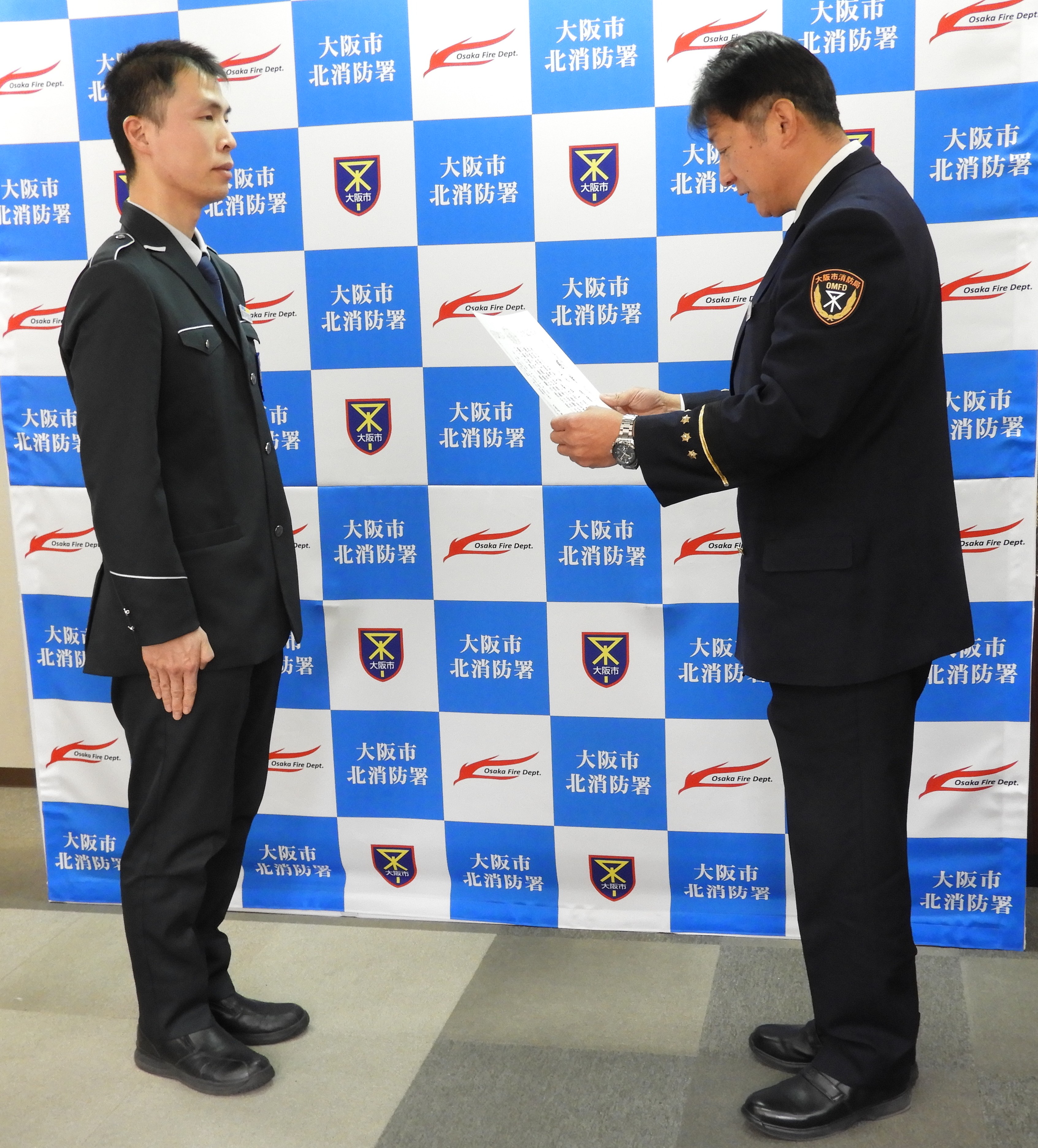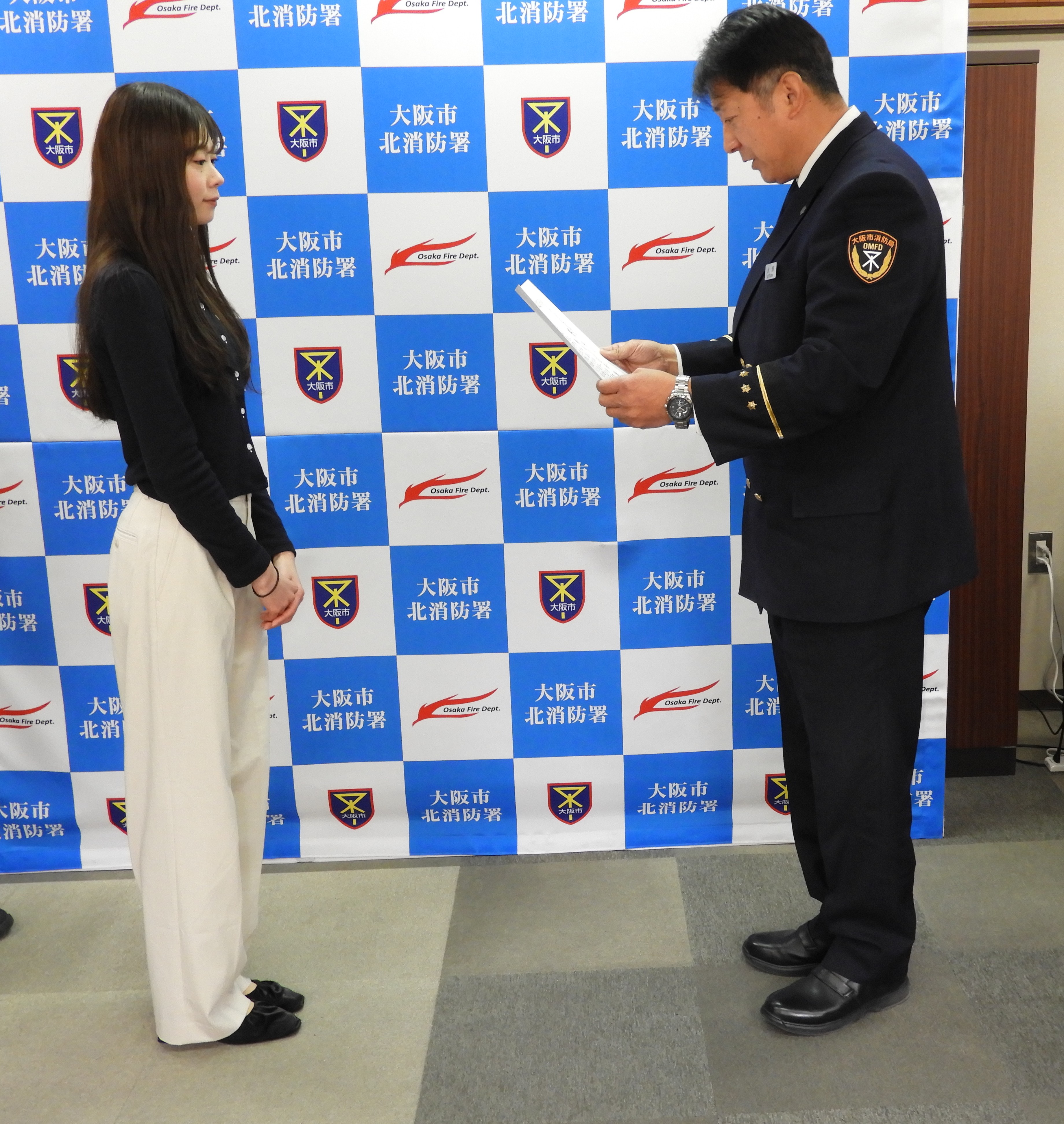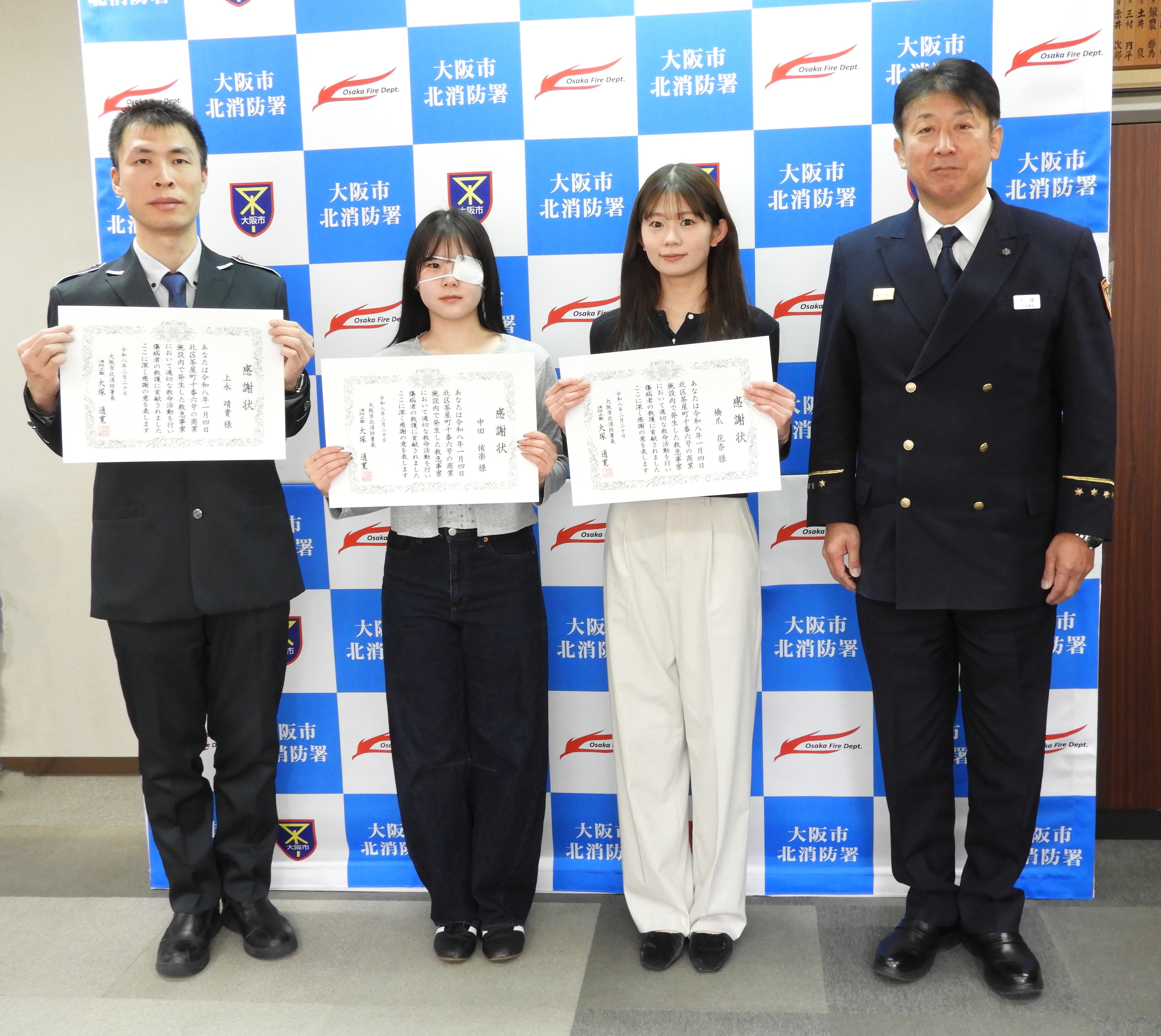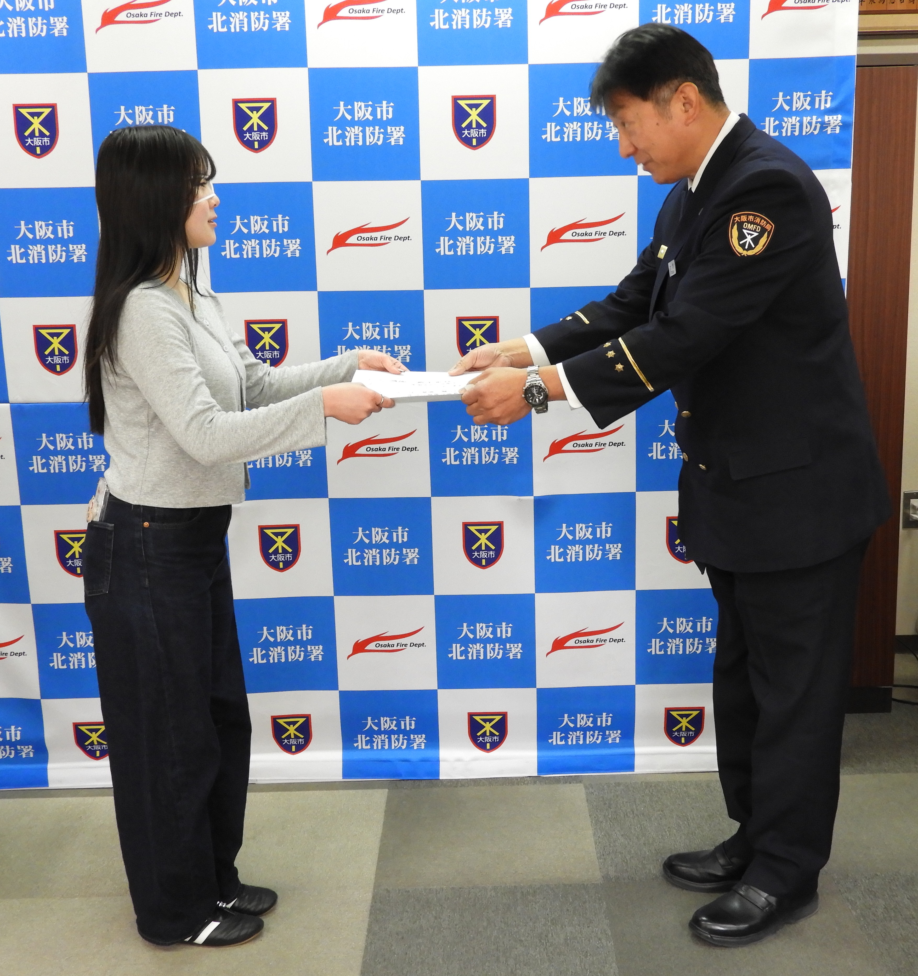 令和8年1月、北区茶屋町の商業施設において、心肺停止状態となった女性に対して、その場に居合わせた大学生の橋爪花奈さんと中田侑楽さん、警備員の上永靖貴さんが連携した救命活動を実施し女性の命を救いました。この救命活動に携わった3名に北消防署長から感謝状が贈呈されました。