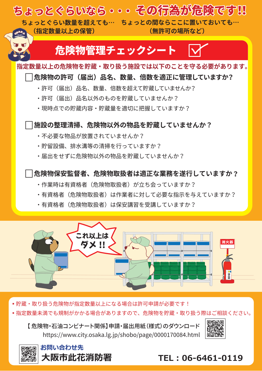 また、指定数量未満でも規制がかかる場合がありますので、危険物を貯蔵・取り扱う際はご相談ください。