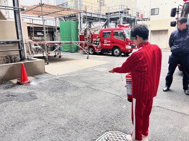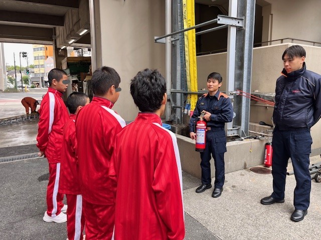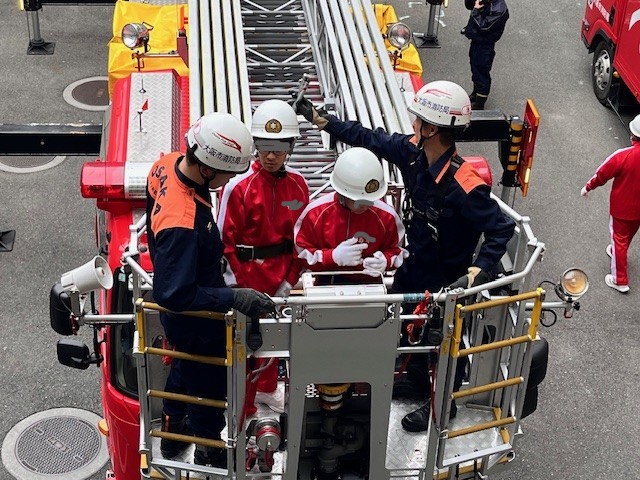 1日目は、署長、指導の警防担当職員へのあいさつから研修が始まりました。消防車両、救急車両、消防署施設内の見学、消火器による初期消火訓練、はしご車のバスケットへの搭乗体験、消防署の業務内容、予防業務を学習しました。