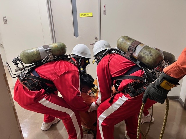 また、実践さながらの面体、空気呼吸器を着装しての人命救助の検索、徒手による搬送訓練など、汗を流し、人を助ける大変さ、搬送する難しさの体験をしてもらいました。