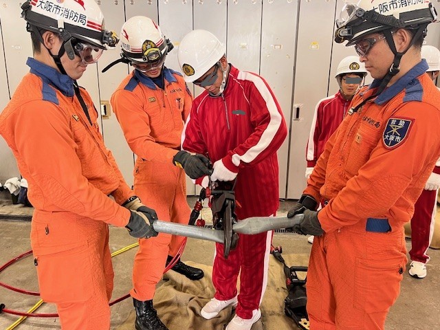 2日目は、消防隊が使用しているホースと筒先による放水体験。救助訓練では、真剣な表情で、救助隊員から救助資器材の説明を受け、油圧式のレスキューツールでパイプを切断したり、変形させたりする訓練を実際に体験。