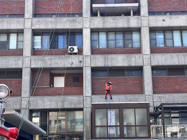 港警察署員による点検、港消防署救助隊による、建物からの救出訓練や救助隊員の懸垂降下による緊急脱出訓練を披露しました。