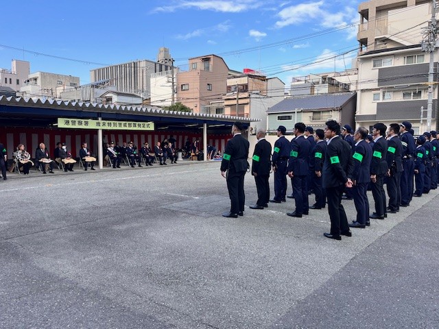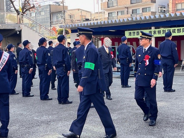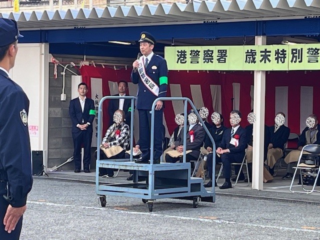 季節もめっきり冬の装いとなり、いよいよ歳末の繁忙期を迎え、 防火・防災意識の普及啓発と火災や事件、事故を未然に防止し、港区民が平穏な新年を迎えていただくことを目的に 、令和7年12月1日月曜日、港警察署と港消防署による歳末特別警戒合同発足式が、港警察署で行われました。