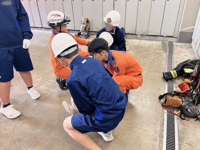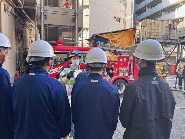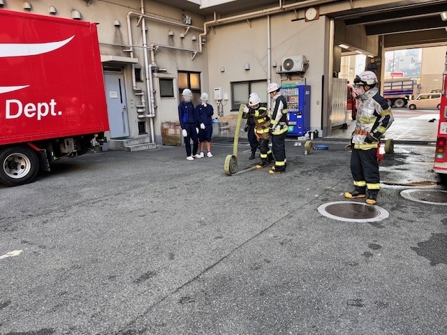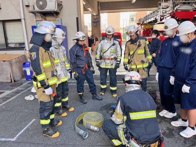 消火隊からホース延長方法の説明を受ける
