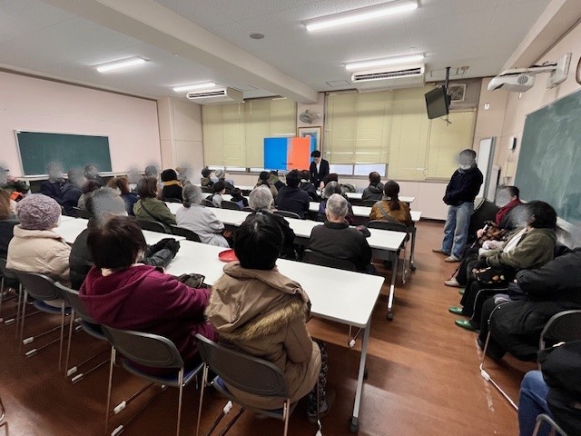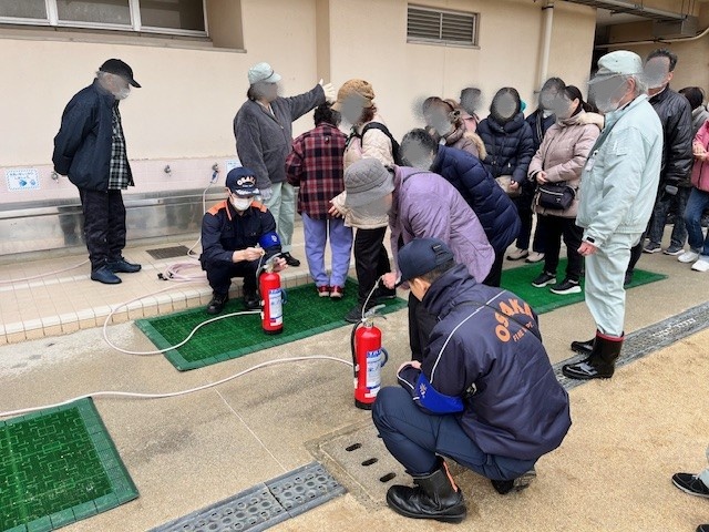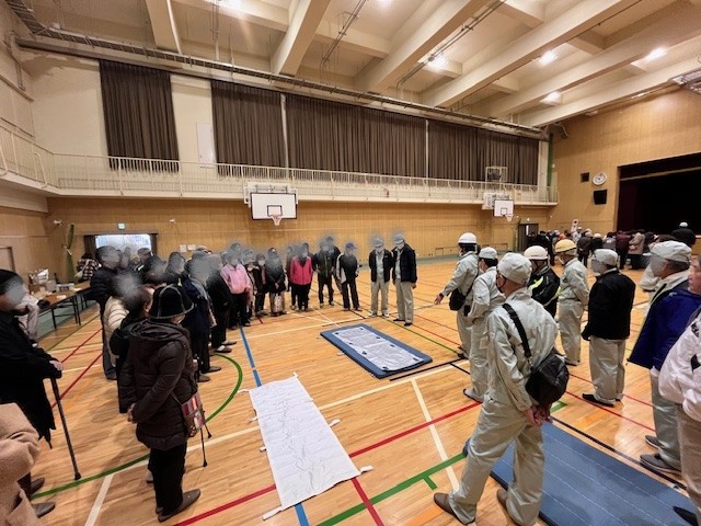 避難訓練を完了し、訓練の説明を受ける市岡連合地域の方々