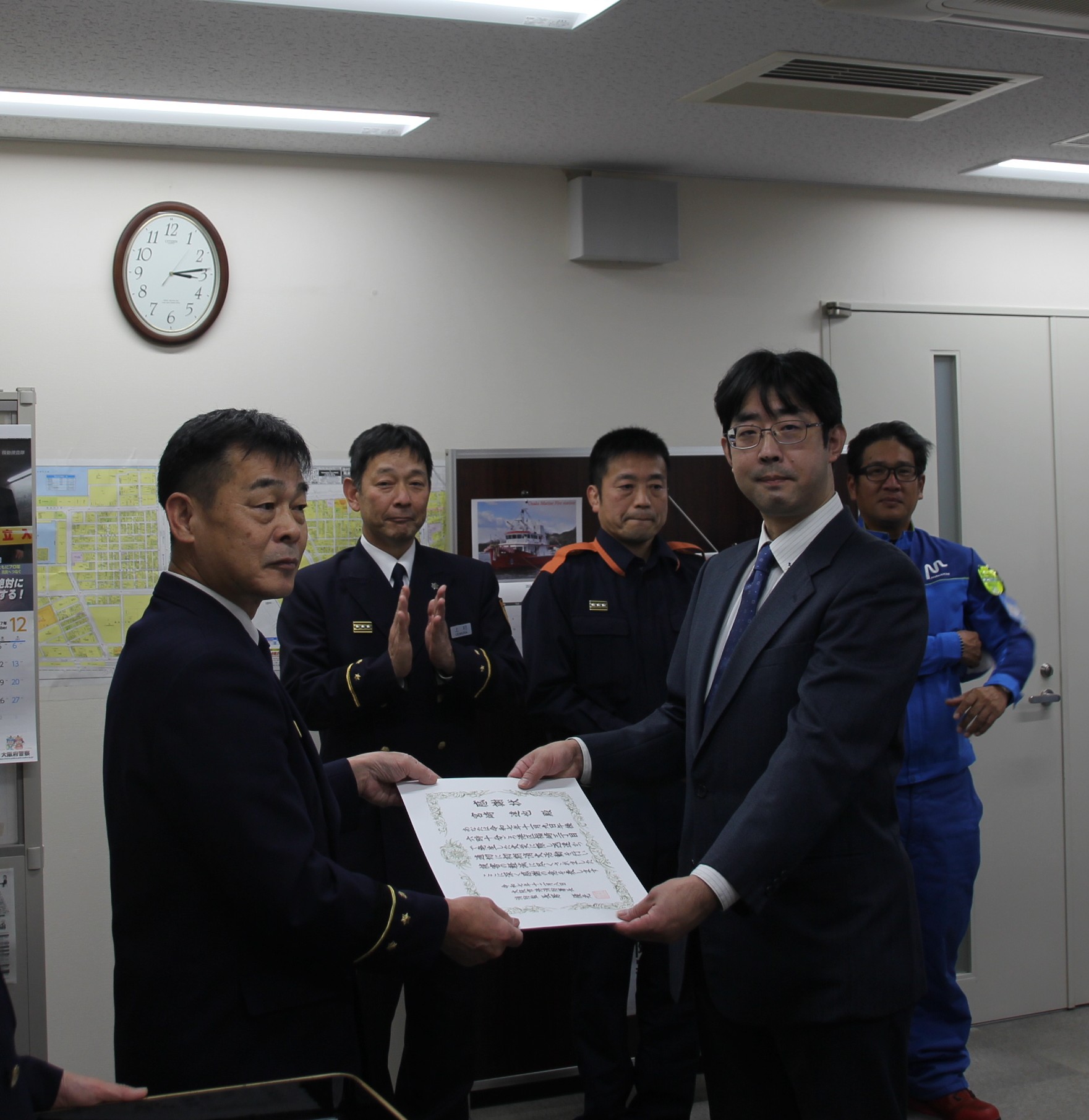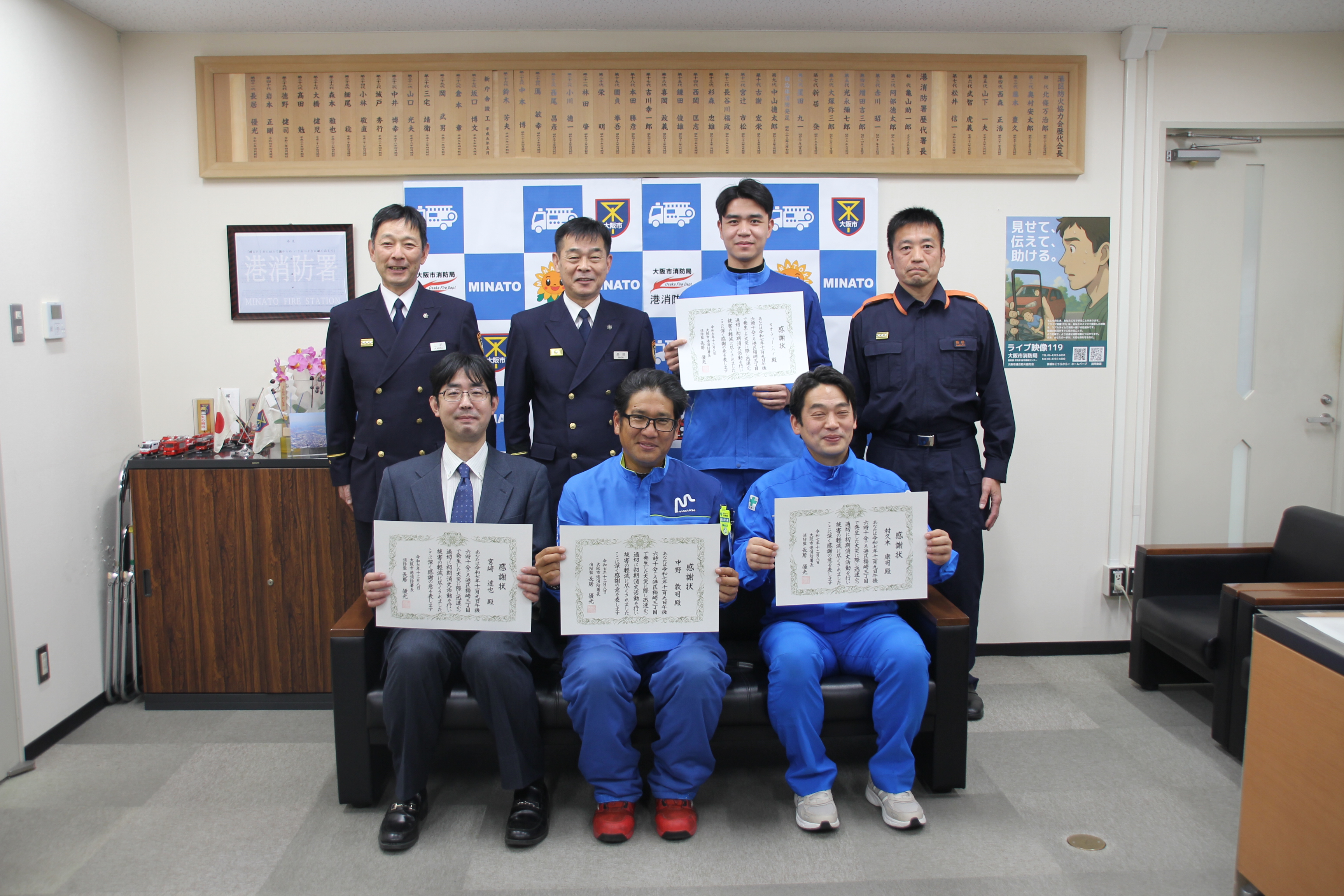 令和7年11月9日(日)18時13分頃、株式会社ロジスティクス・ネットワーク職員の宮崎 達也氏、中野 敦司氏、間口ロジスティクス株式会社の村久木 康司氏、カオ・フィー・ハイ氏は、自社の隣のフォークリフト2台が燃えているのを発見して消火器による初期消火を行い、隣接する倉庫等への延焼防止に貢献されました。4人の勇気ある行動を称え、港消防署長より感謝状が授与されました。
