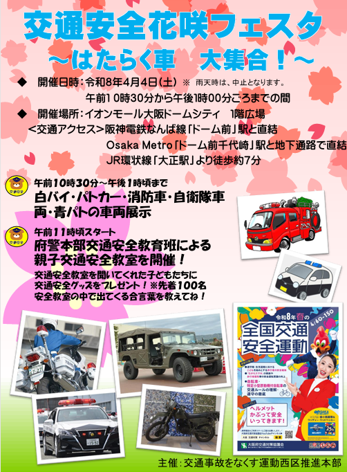 令和8年春の全国交通安全運動の一環で、交通安全花咲フェスタ~はたらく車大集合!~と題して、白バイ・パトカー・自衛隊車・ミニ消防車などが集まるイベントが開催されます。4月4日土曜日午前10時30分~午後1時ごろまで イオンモール大阪ドームシティ1階屋外広場へみんな集まれー!! 素敵なプレゼントも用意しています。