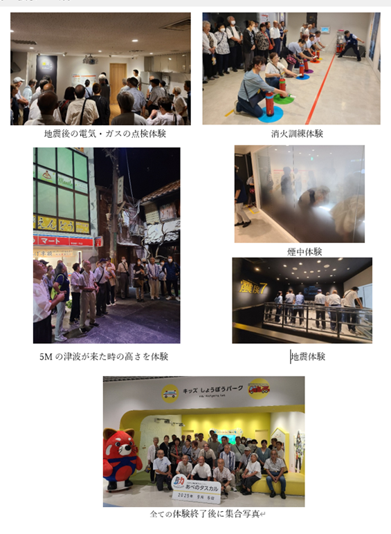 天下茶屋地域30名の方々が、あべのタスカルで防災訓練を体験しました。地震体験コーナーでは大きな揺れを実際に体感し、身の守り方や避難の重要性を再認識しました。煙中体験では視界の悪さや息苦しくなった時の対処法などを実感し、落ち着いて避難する練習ができました。また、消火訓練では消火器を使い、初期消火の方法を学びました。参加者からは「いざという時の備えが大切だと感じた」という声が多く聞かれました。