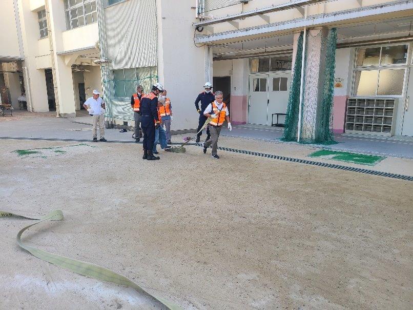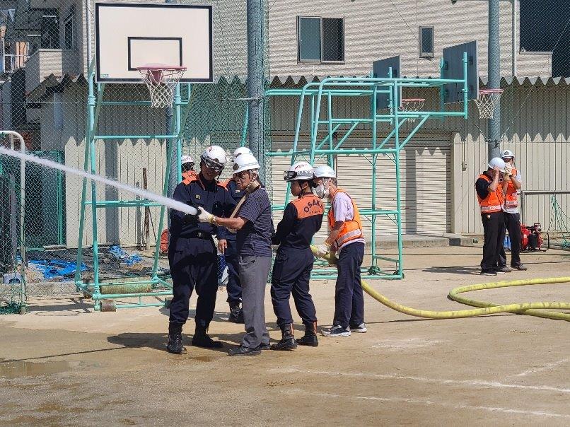 さらに、可搬式ポンプによる放水訓練やホース延長訓練も実施され、参加者は実際に器具を操作しながら緊急時の対応について理解を深めました。特にホース延長訓練では、協力して作業を行うことの重要性や、チームワークの大切さが再確認されました。
