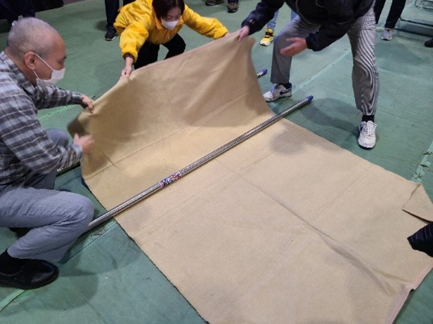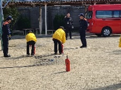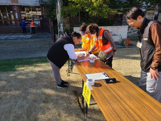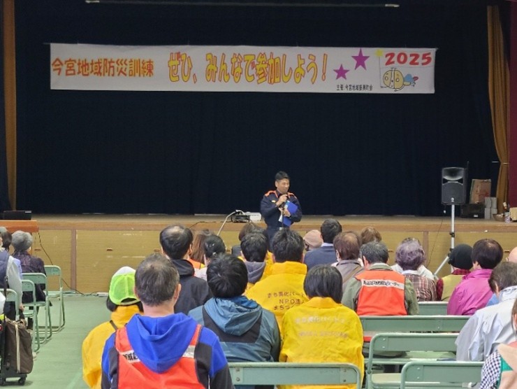 11月3日月曜日の朝9時より、もと今宮小学校において直下型地震を想定した防災訓練が実施されました。今宮地域の住民の方々が一次避難場所である同小学校に避難する訓練を行い、あわせて避難所の開設訓練も行われました。まず、避難者の受付対応訓練で、緊急時に住民の安否確認や名簿作成を実際に体験しました。その後、水消火器を使った初期消火活動の訓練が行われ、消火器の取り扱いを学びながら、不慮の火災発生時に備えました。さらに、倒壊家屋の下敷きになった人を救出する訓練や、応急担架を用いた負傷者の搬送方法など実践的な内容にも取り組みました。最後に炊き出し訓練では、避難者に温かい食事を提供する体験を通して、災害時の共助の重要性を確認しました。参加者全員が真剣に訓練に臨み、防災意識と対応力の向上を図られました。