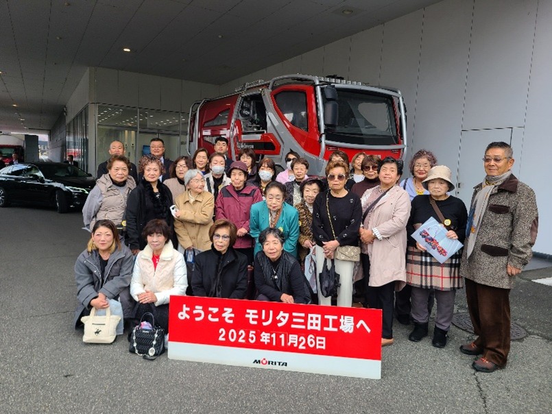 令和7年11月26日(水)、”青少年を守る母の会”では防災研修の一環として、アジア最大級の消防車製造工場であるモリタ三田工場を見学しました。同工場は日本国内で稼働する消防車の半数以上を製造しており、最新技術や安全性を追求した車両の開発現場を間近に見ることができました。参加者は工場担当者から消防車の組立工程や品質管理、災害時に重視される機能などについて丁寧な説明を受け、防災の最前線となる車両がどのように生み出されているのかに驚きと関心を寄せていました。本研修を通じて、消防車の重要性や防災意識の高揚が図られ、今後の地域活動にも大いに役立てたいとの意見が多く寄せられました。
