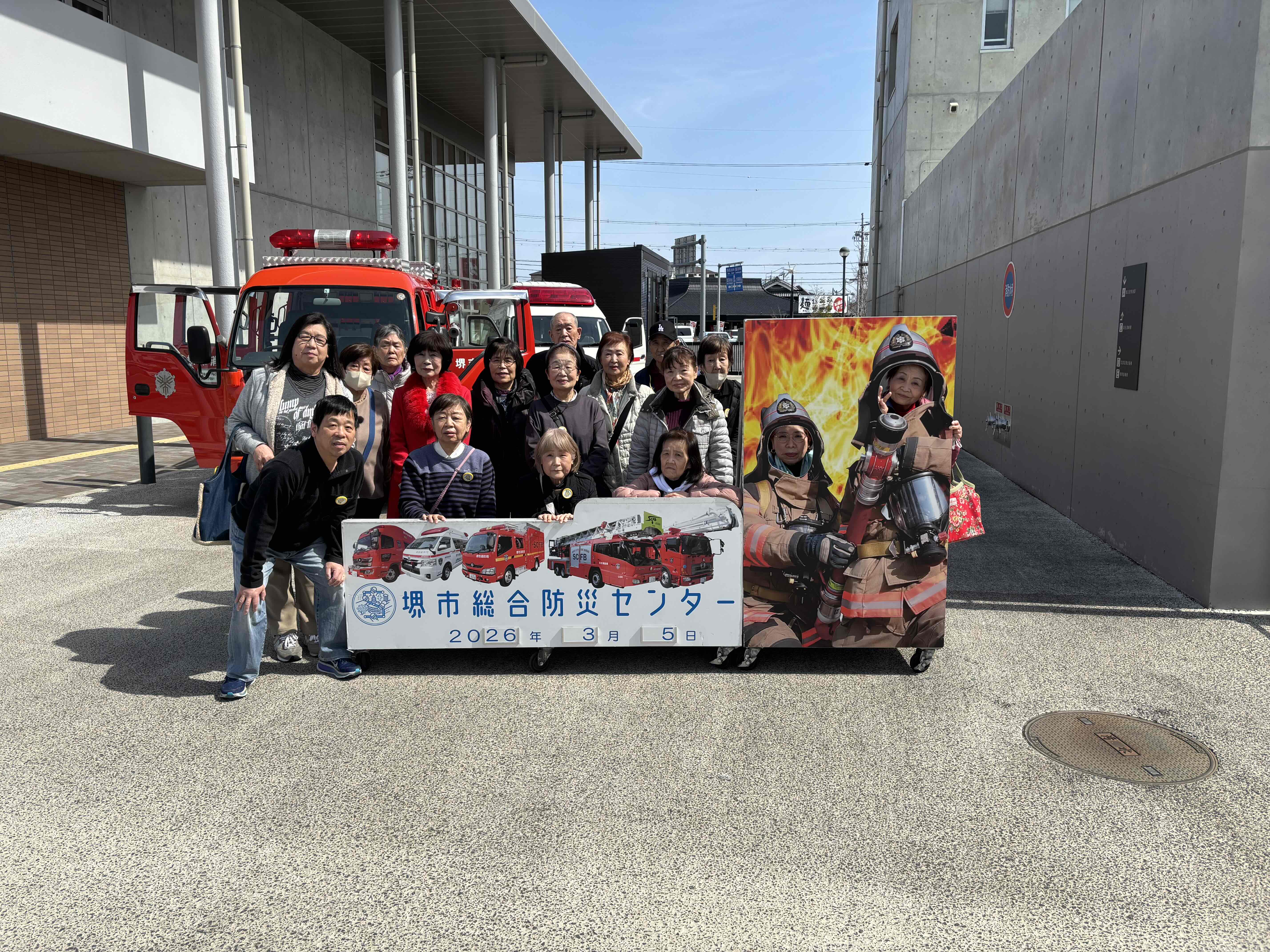 令和8年3月5日木曜日 松之宮連合の皆様が堺市総合防災センターで行う防災研修に参加されました。研修では、堺市における過去の地震体験から現在取組んでいる防災について説明を受けた後、施設において地震体験、消火体験、煙・暗闇体験など、実際に地震や火災が発生した時の対応を実体験でき、参加者一同、深い感銘を受けていました。また防災においては特に地域の絆が防災力の向上につながることを実感する研修となり、「地域で支え合う大切さを再認識した」との声も多数寄せられました。