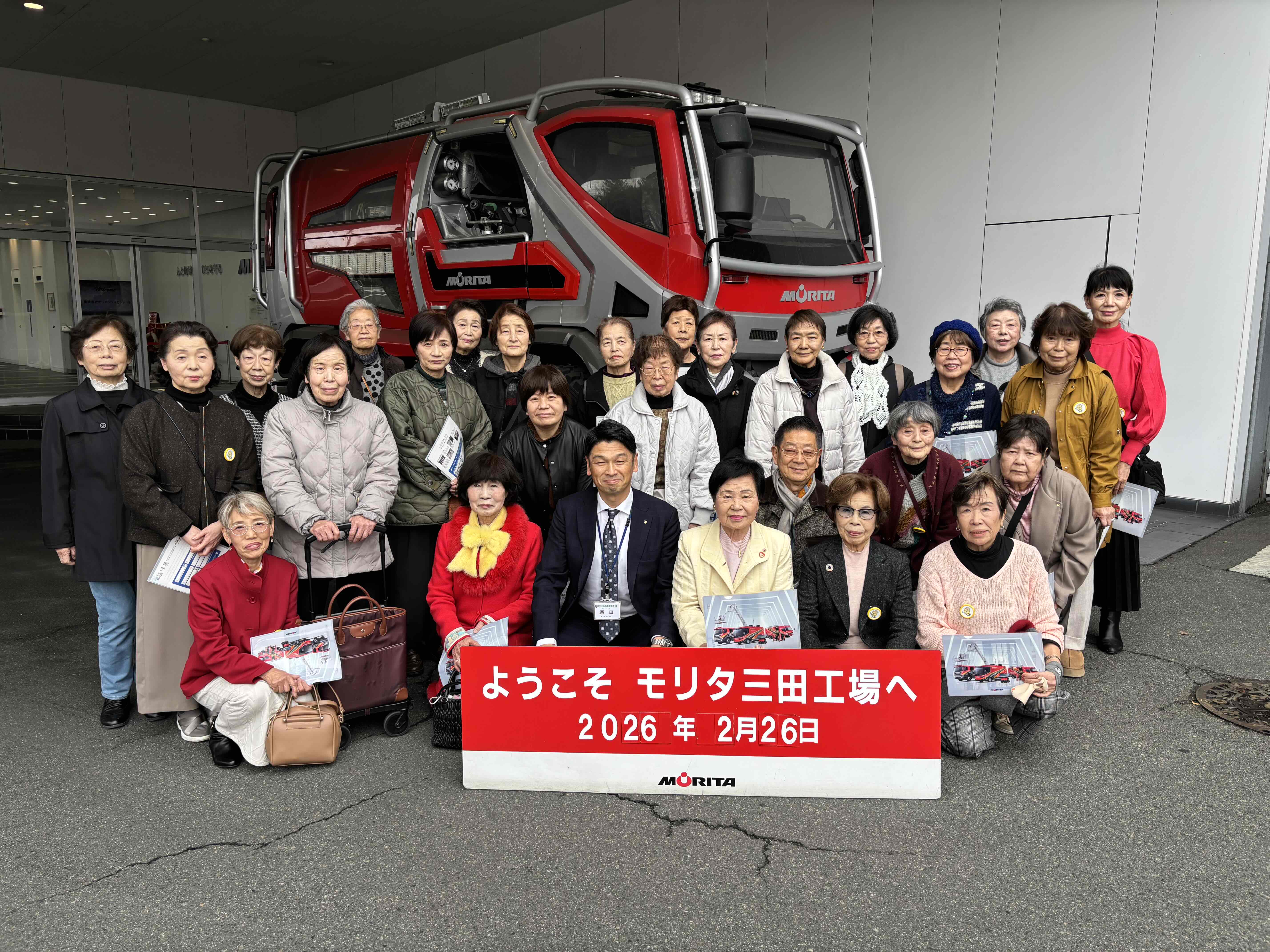 令和8年2月26日(木)、西成区女性防火クラブ員の皆様は、モリタ三田工場にて研修を実施しました。はじめに工場概要の説明を受けた後、製造現場を見学し、日本各地の消防署からの要請に応じて、消防車が一台一台、工程ごとに丁寧に手作業で仕上げられていることを学びました。大量生産ではなく、地域の運用や装備に合わせて細部まで作り込まれている点に、参加者はそろって驚き、同時に高い信頼性に深い感銘を受けました。