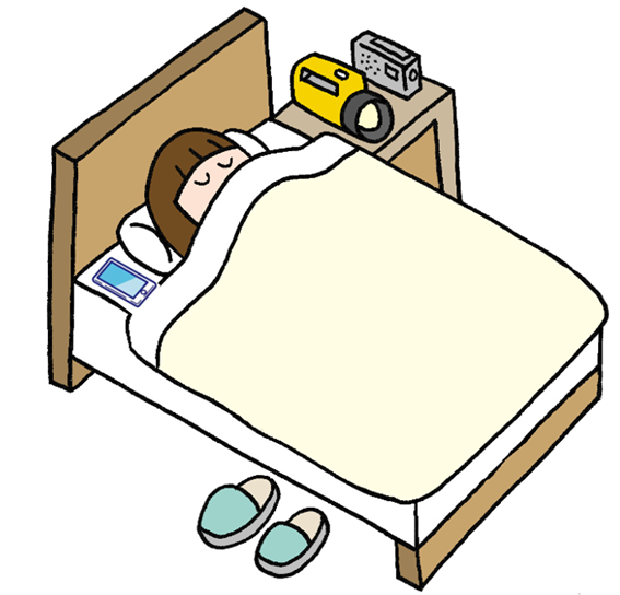 枕元に ①懐中電灯(停電対策) ②スマートフォン(情報収集) ③スリッパ(ケガ防止)