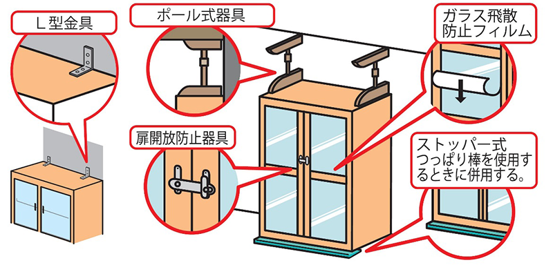 - タンスや本棚を固定する ・頭上に落下物がない配置にする