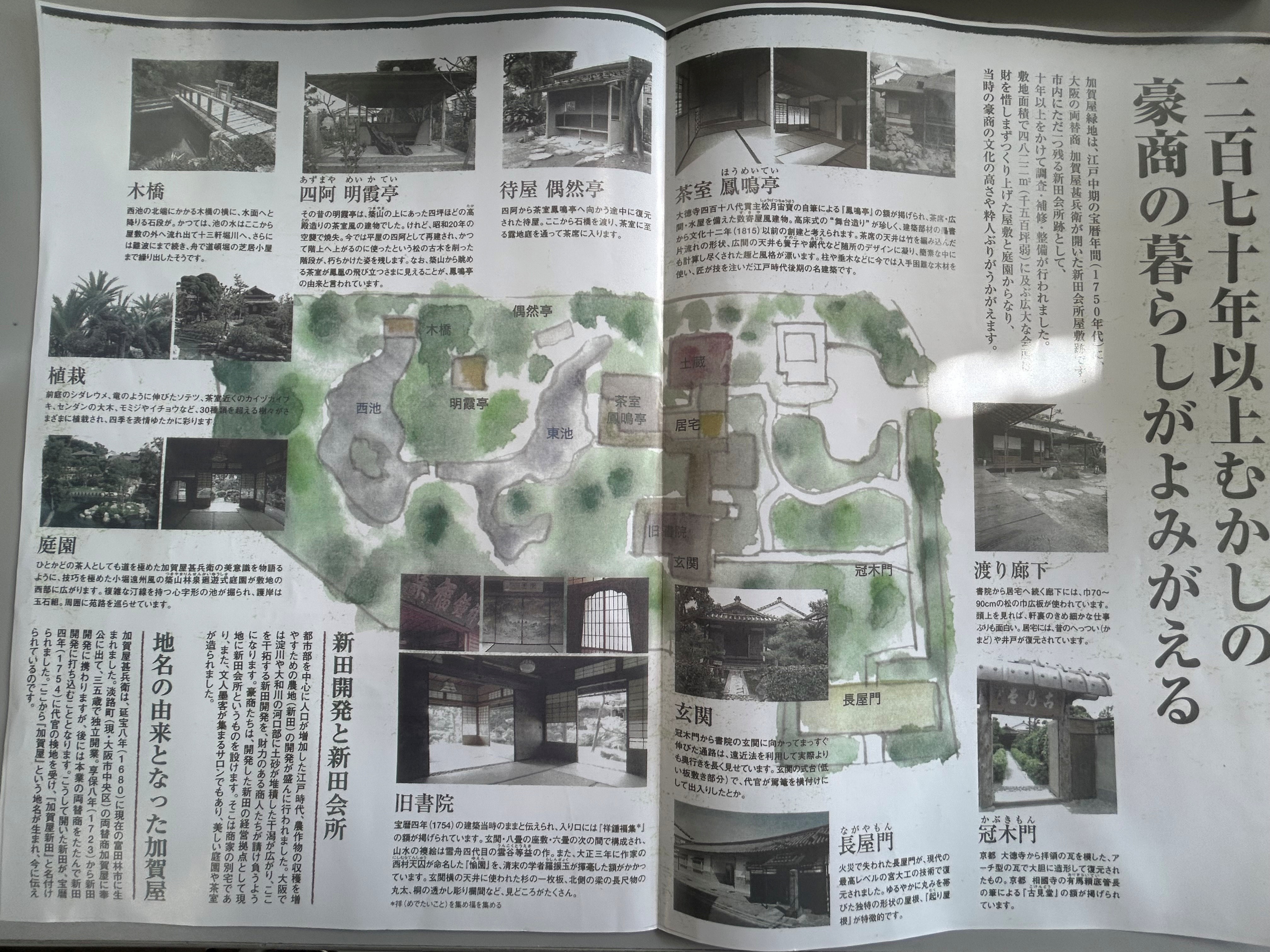 加賀屋新田は延享2年(1745)大阪淡路町の両替商、加賀屋甚兵衛によって開発が始められました。敷地内東半部には鳳鳴亭、書院、居宅、土蔵などの建築群が残り、またその西側には庭園が広がり、往時の新田会所の屋敷景観を今に伝えています。