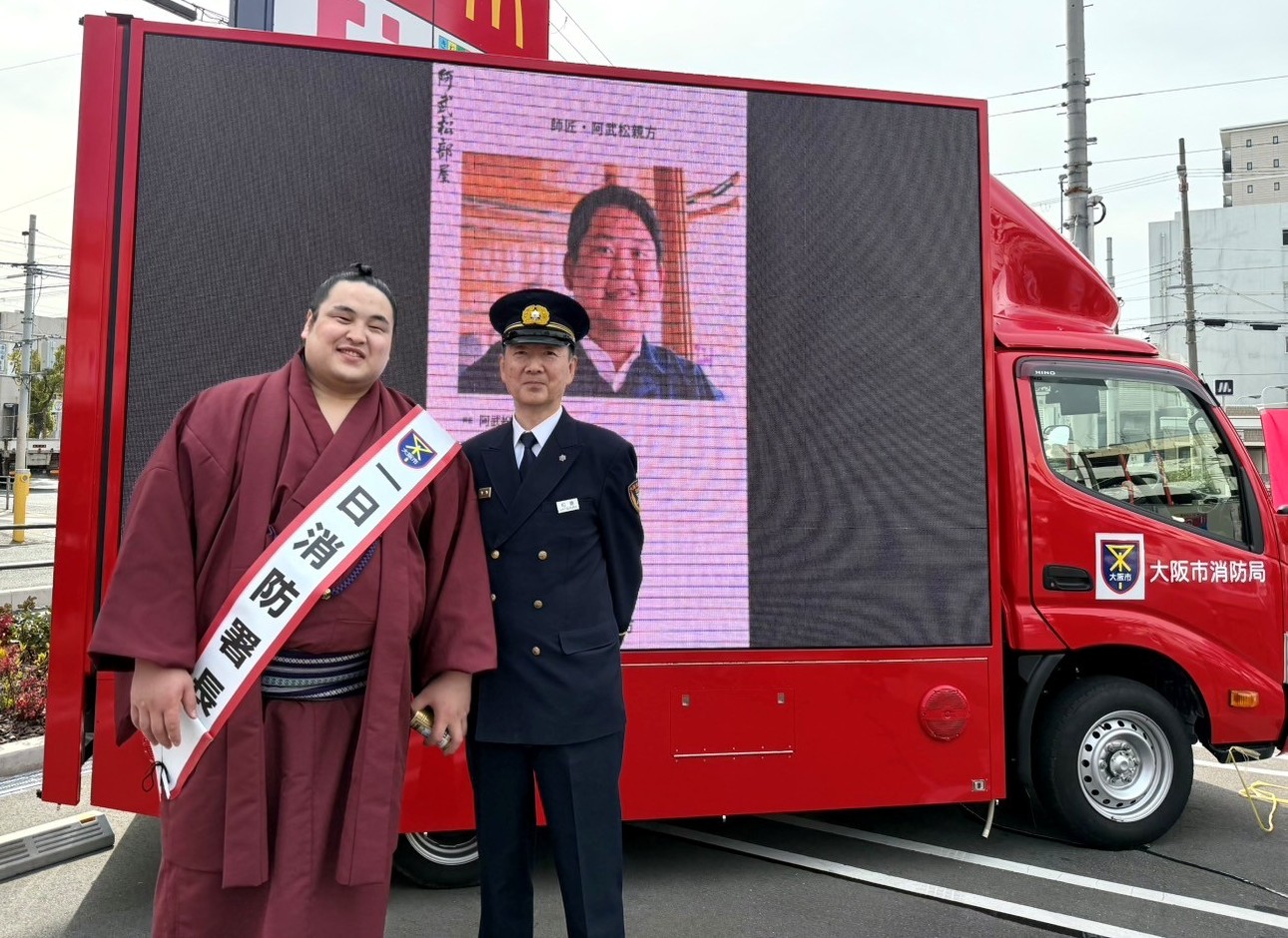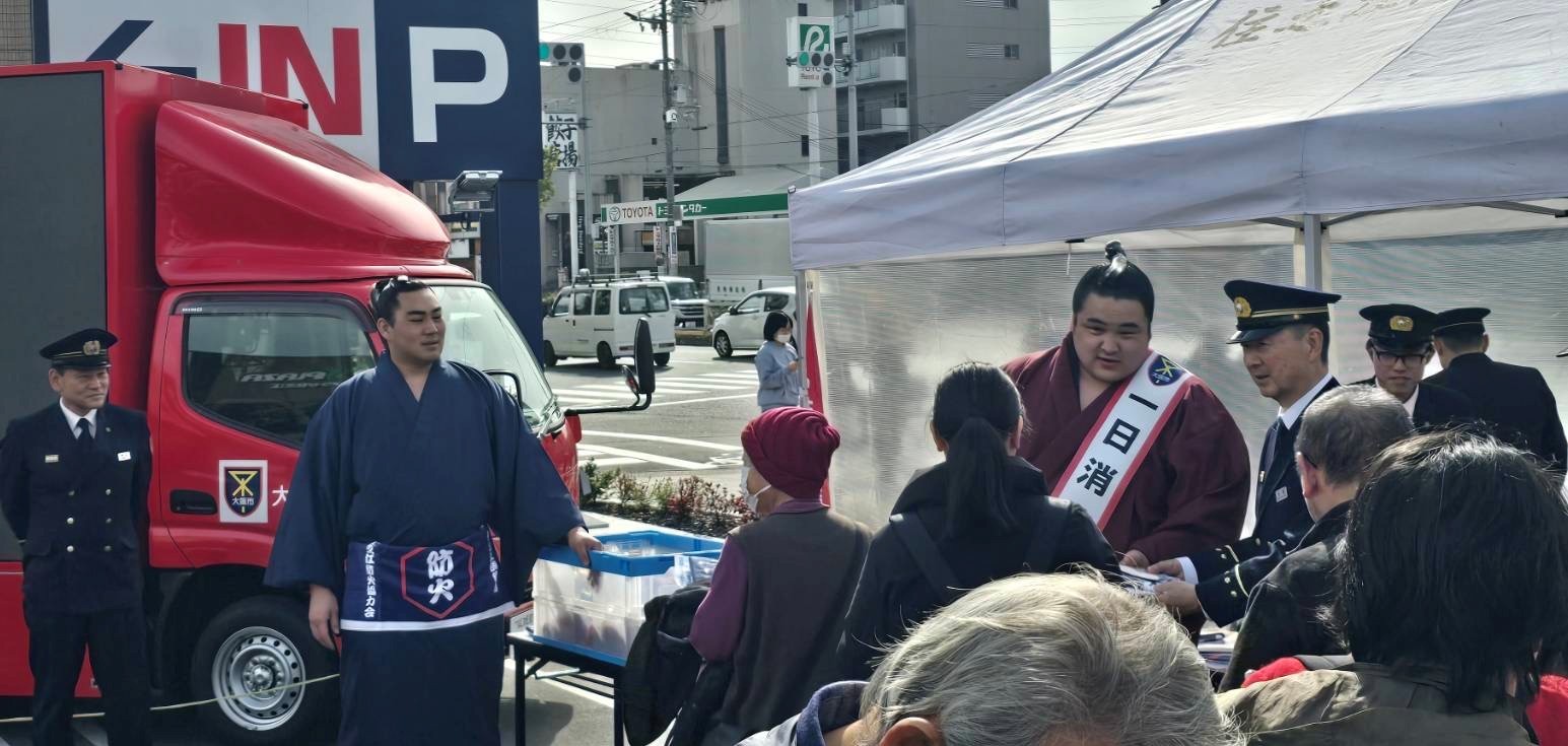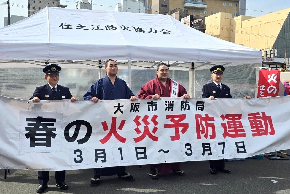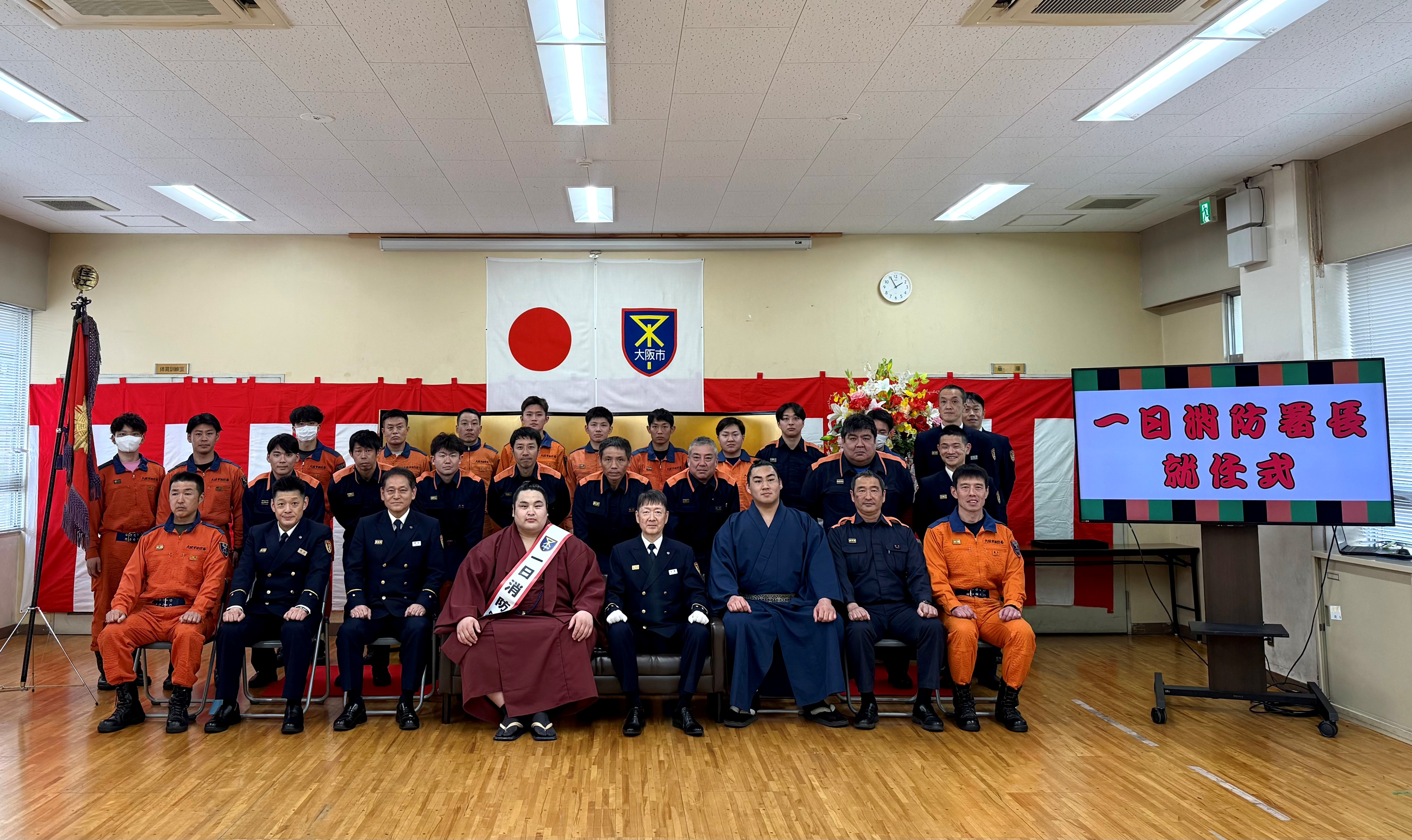 2月24日(火)、春の火災予防運動のイベントとして、阿武松部屋の幕内力士「阿武剋」関に、住之江消防署の一日署長に就任していただきました。