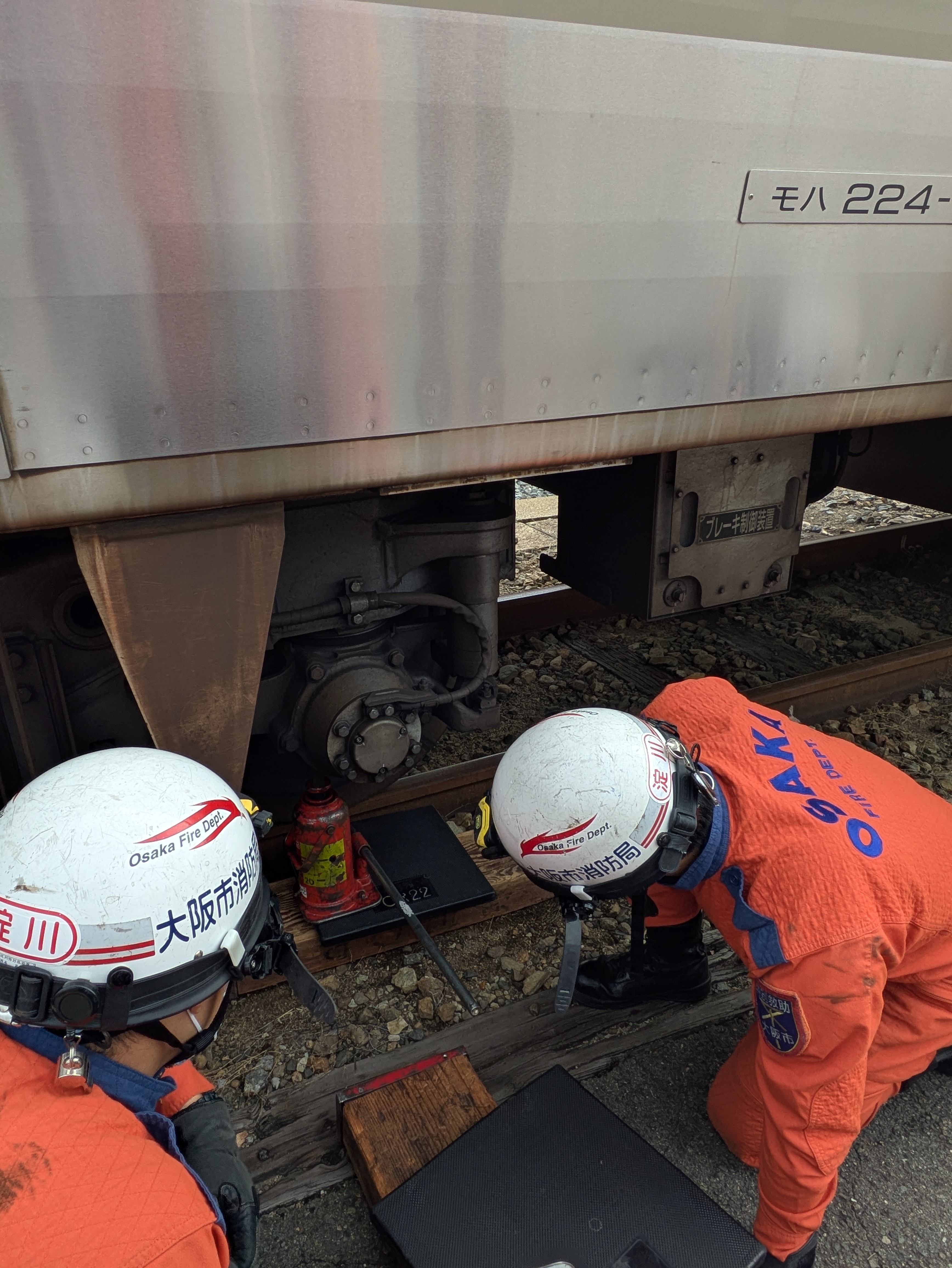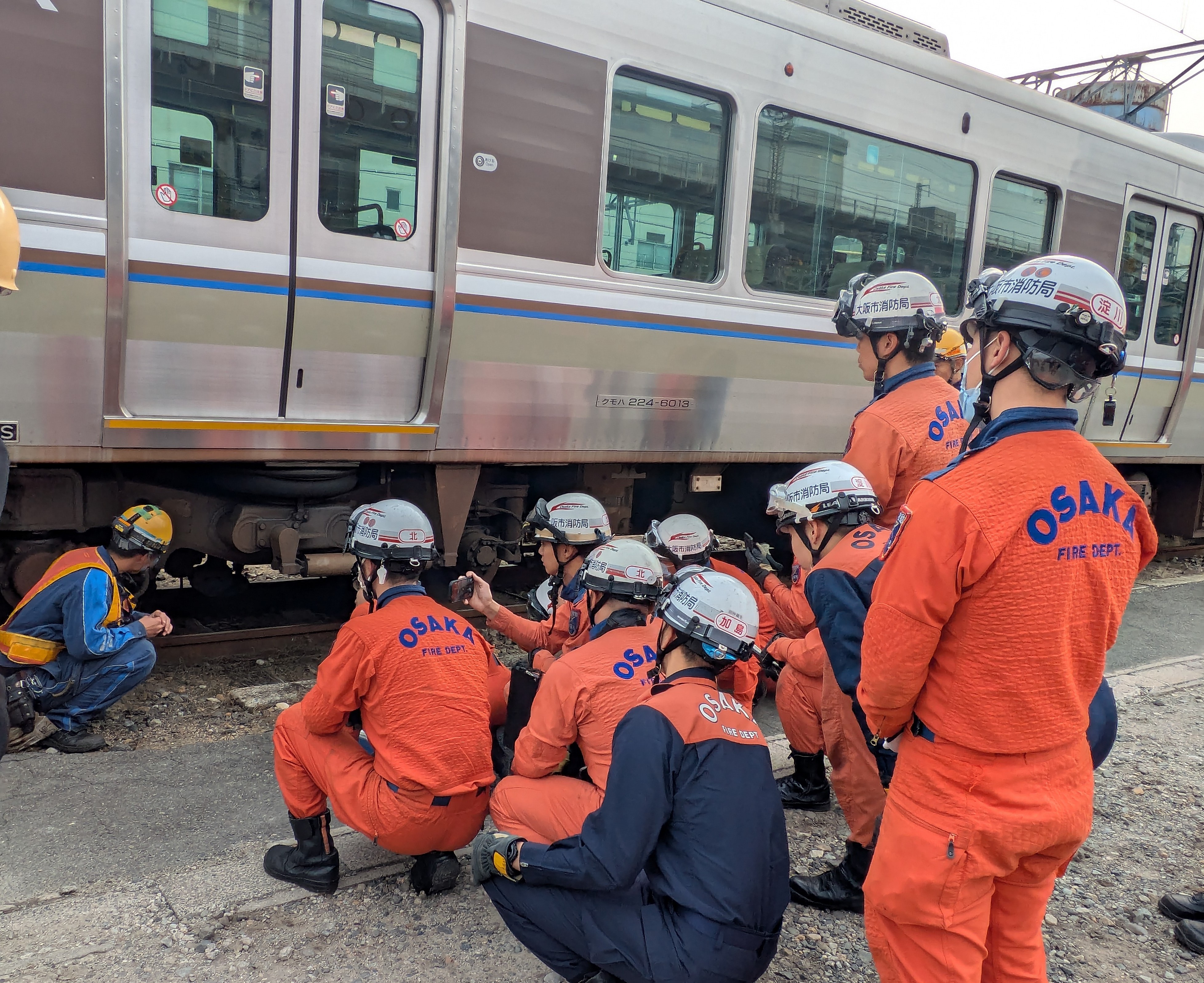 この訓練はJR西日本様の御協力のもと、鉄道車両の構造に関する理解やJRと消防機関との相互連絡・協力体制の強化を目的として行われました。