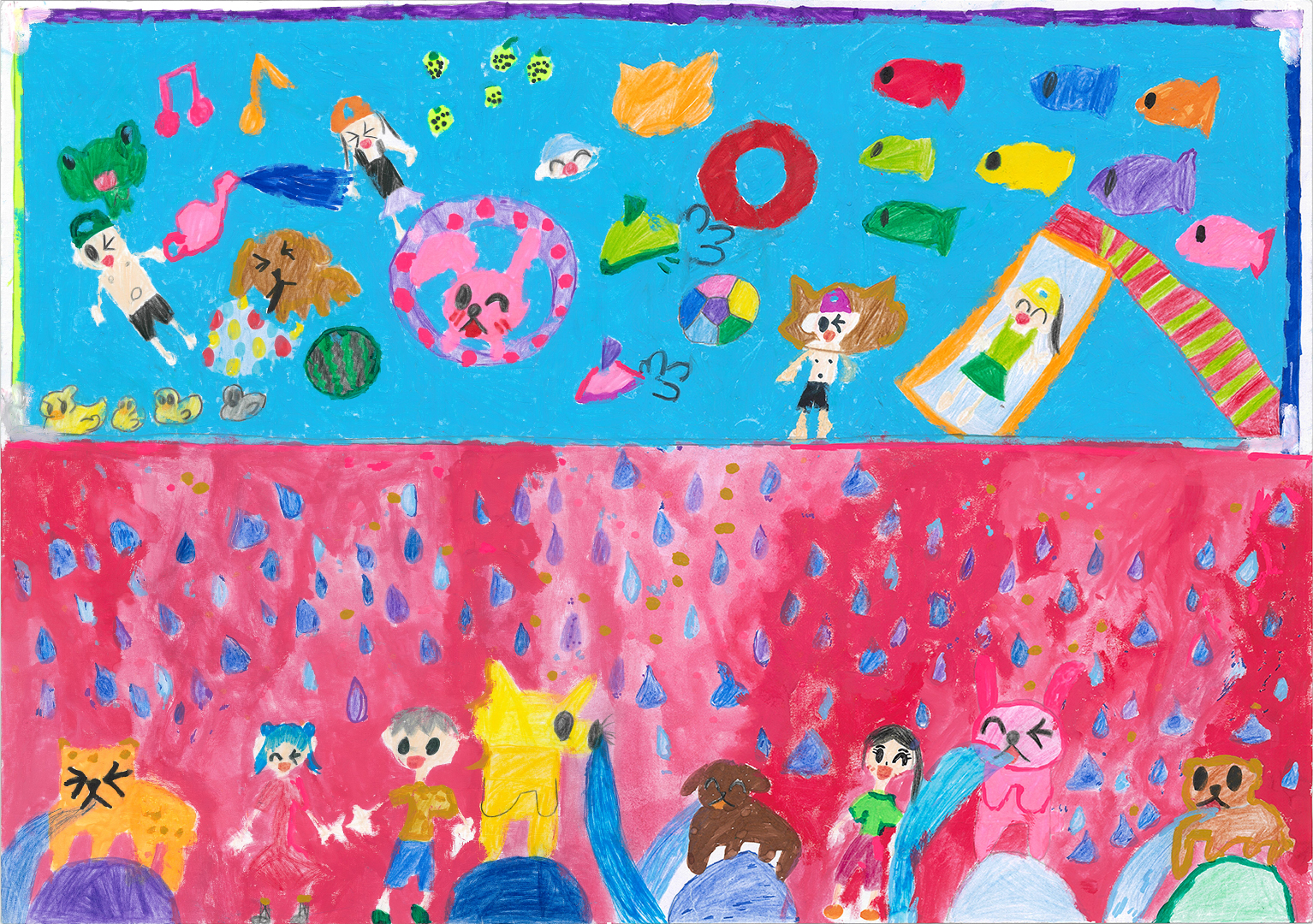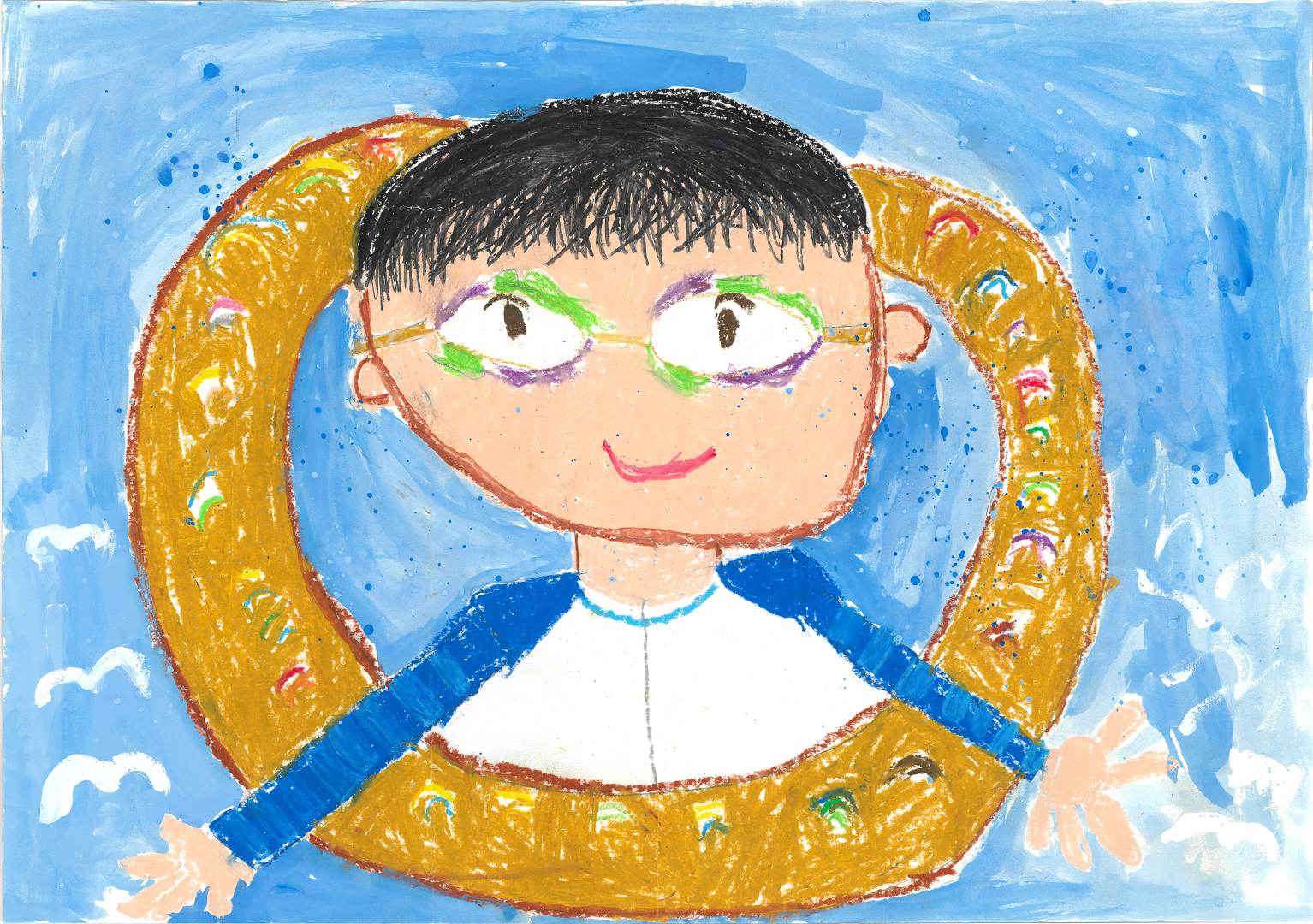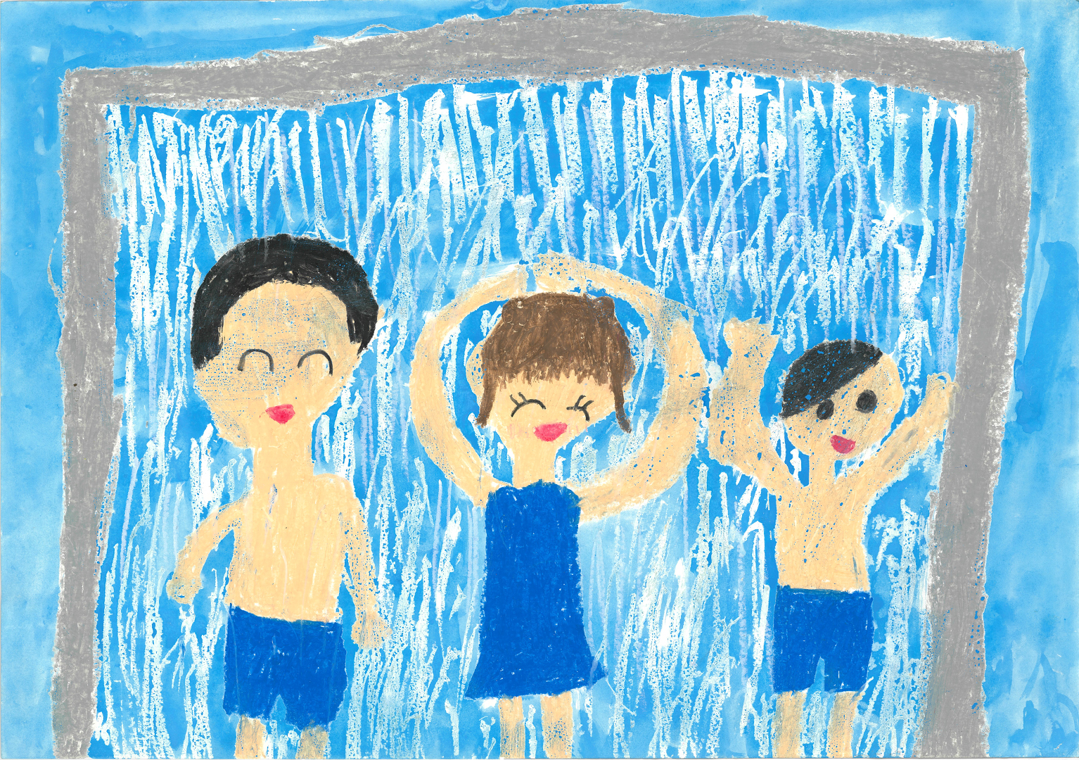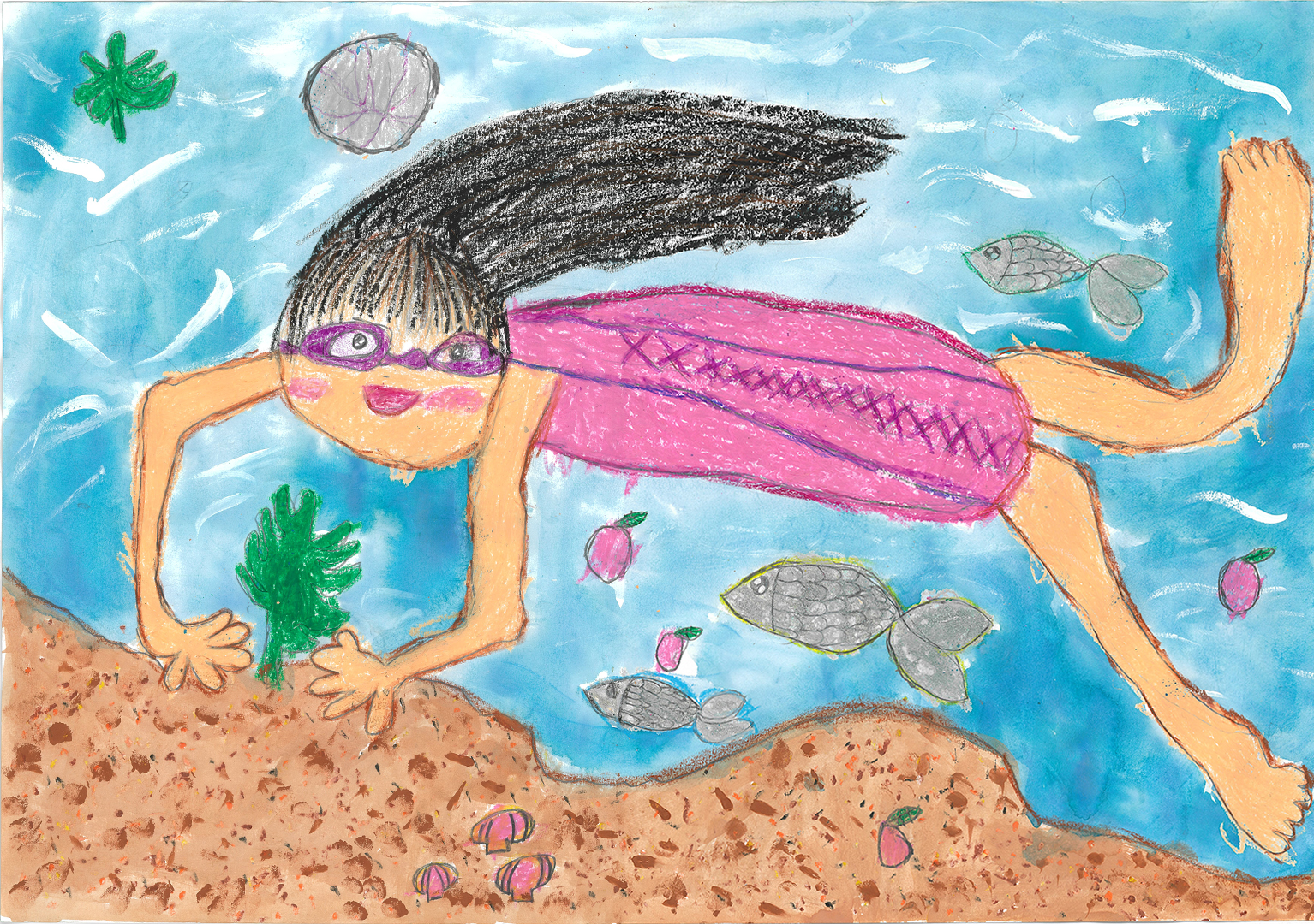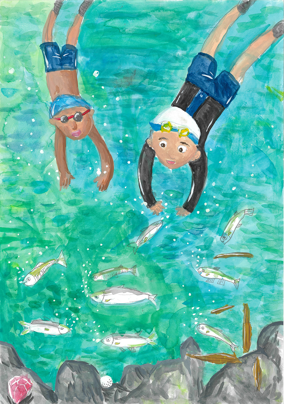 絵の説明:従兄弟と川にもぐって宝さがしをして遊んだようすを描きました。お日さまの光でキラキラきれいな水の中をお魚といっしょに泳げて楽しかったです。このきれいな水をこれからも大事にしたいです。
