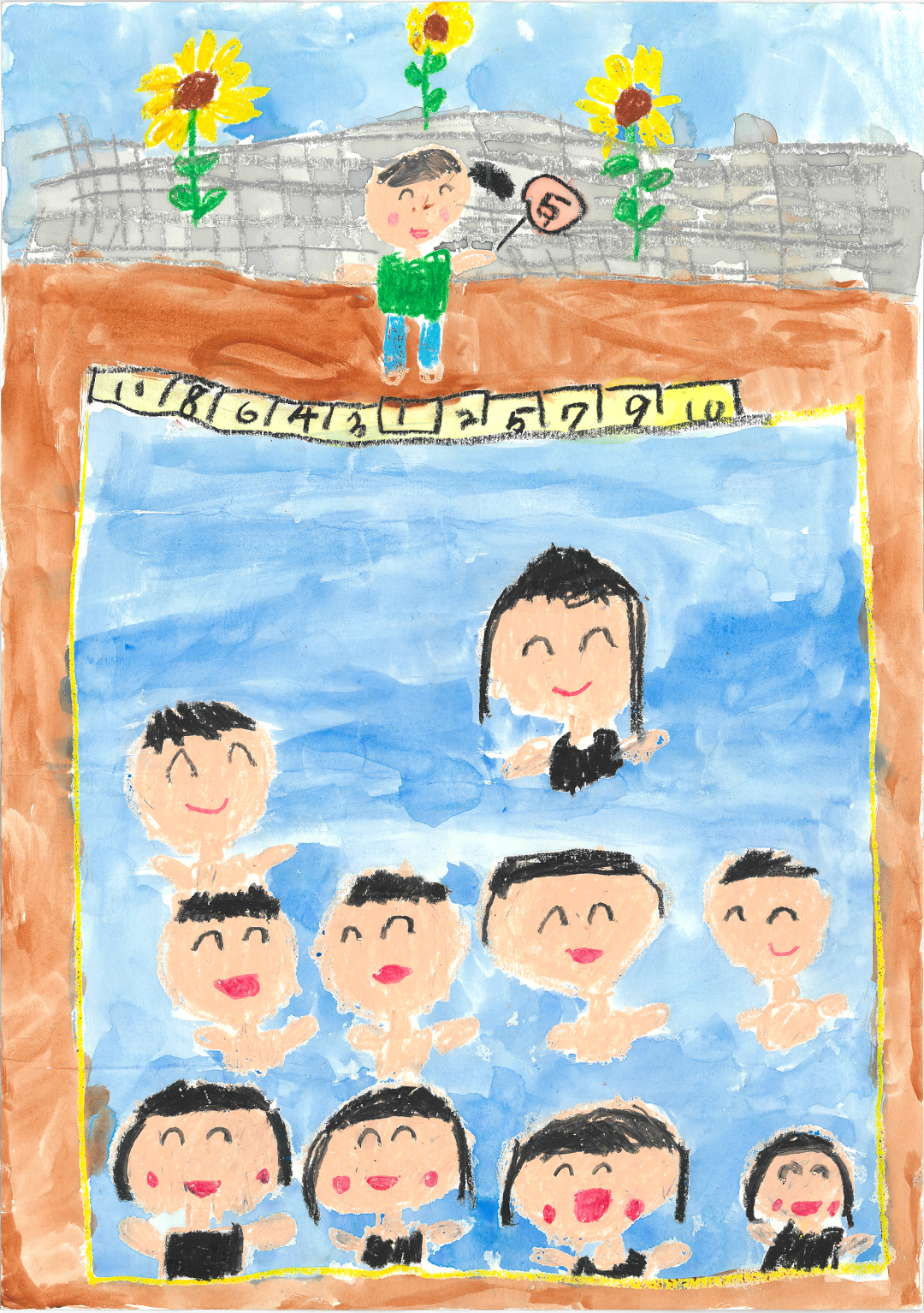 絵の説明:学校のプールでお友達と一緒に遊んでいる絵です。プールサイドにいるのは先生です。