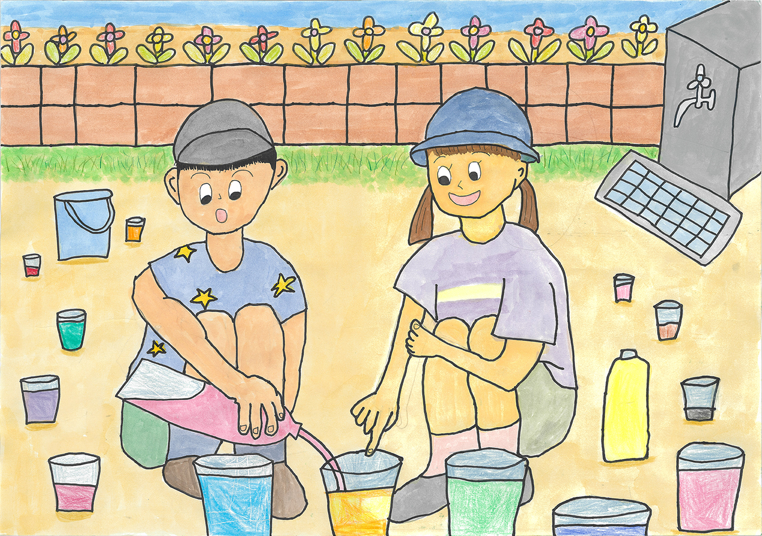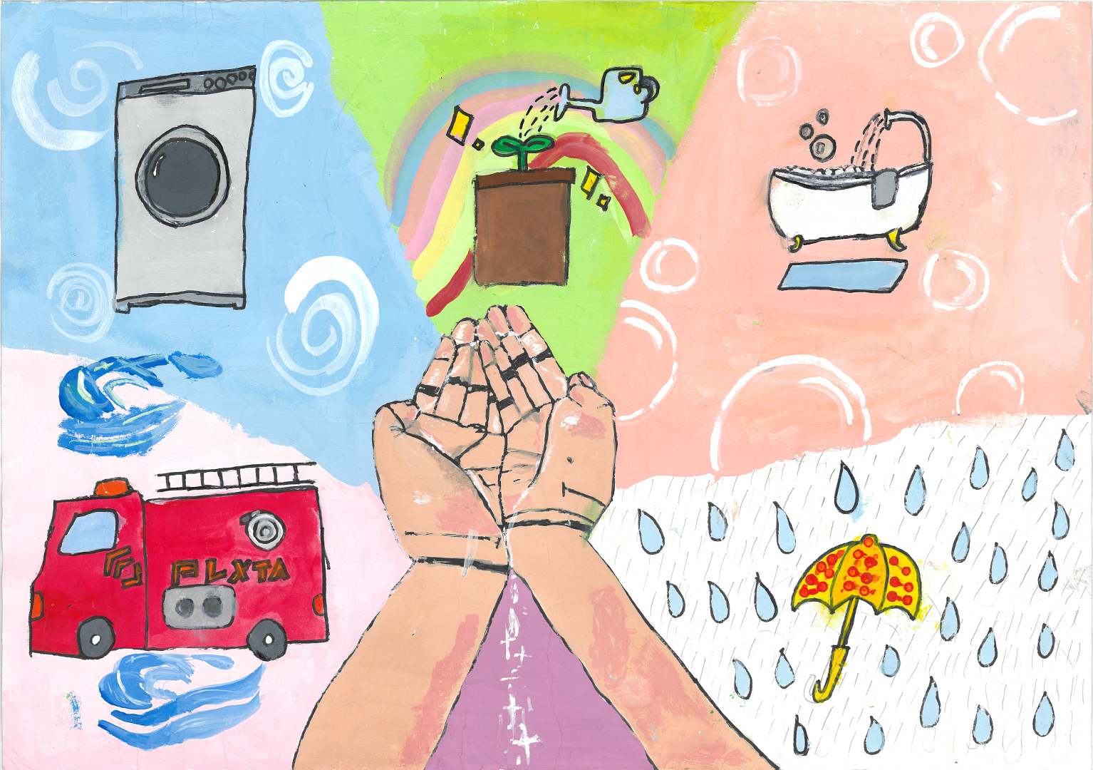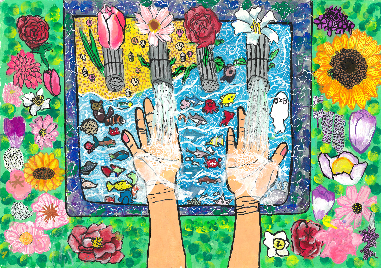 絵の説明:水の大切さを伝えたくて描きました。手洗いや植物の成長、海の生き物など、水があるから人も生きられることを表し、水を大切にしたい気持ちを込めました。