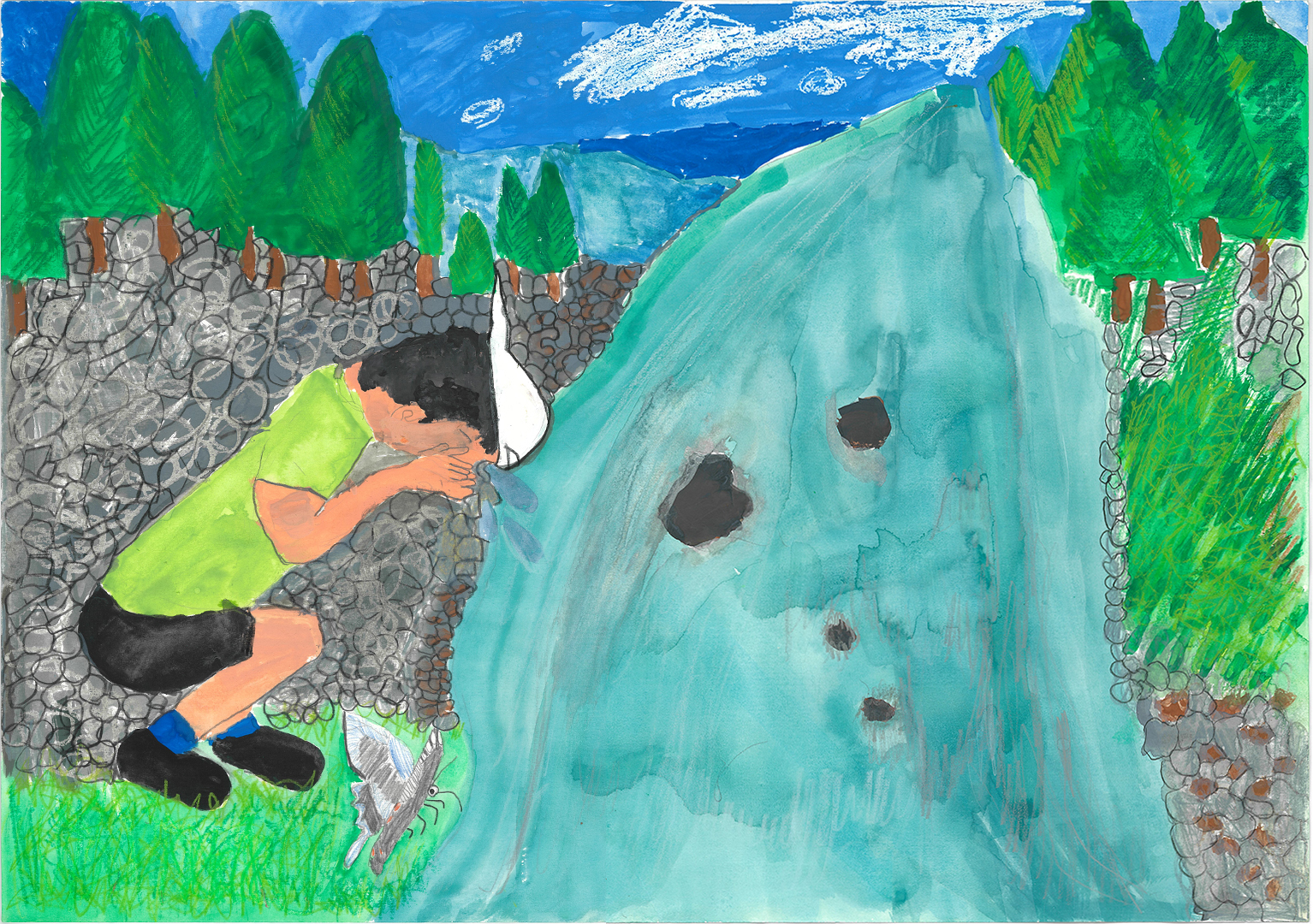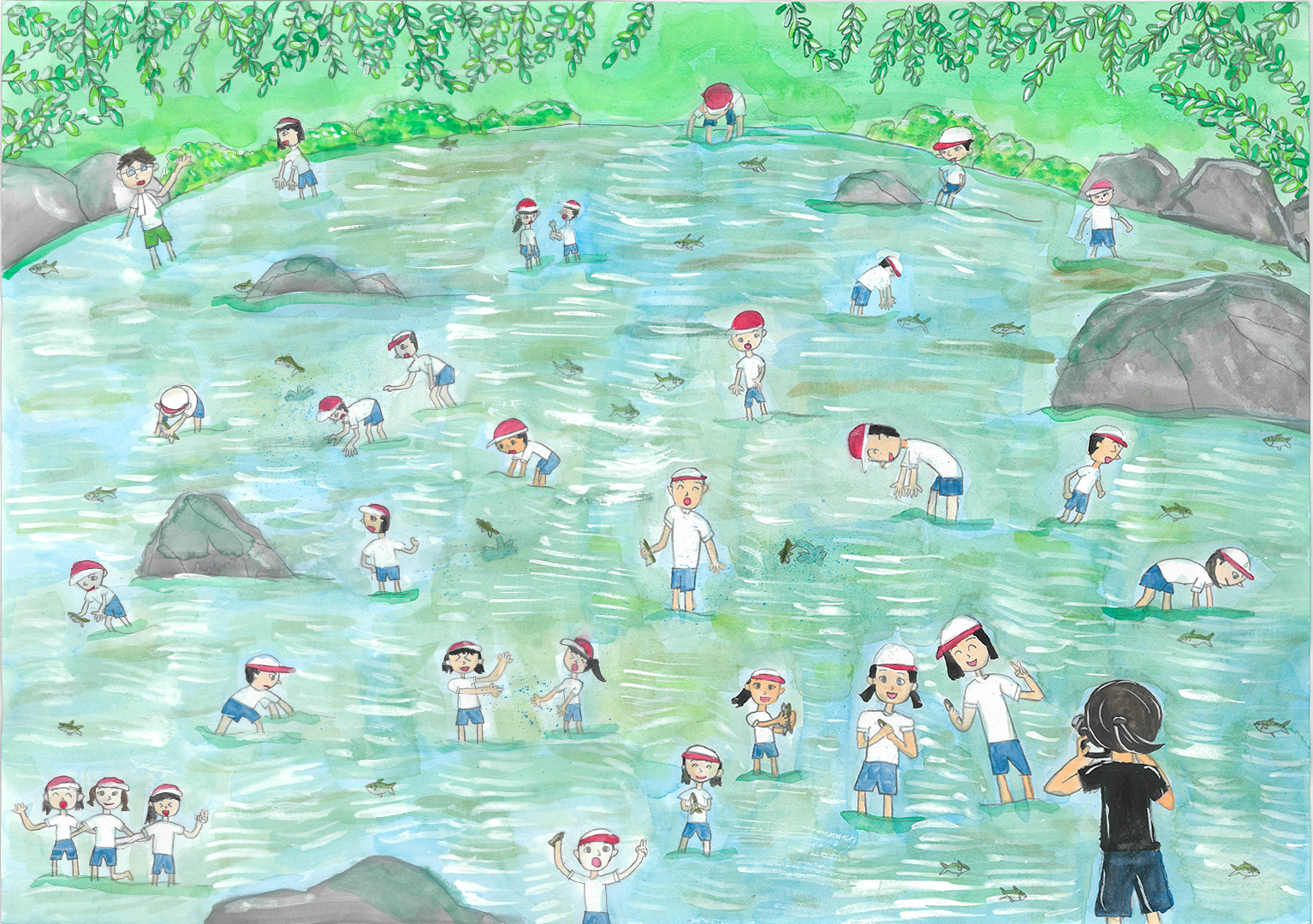 絵の説明:夏休みに林間学習に行って、魚つかみをしました。初めての魚つかみでドキドキしたけど、友達と協力しながらできたことが印象に残ったので、思い出を絵にしました。