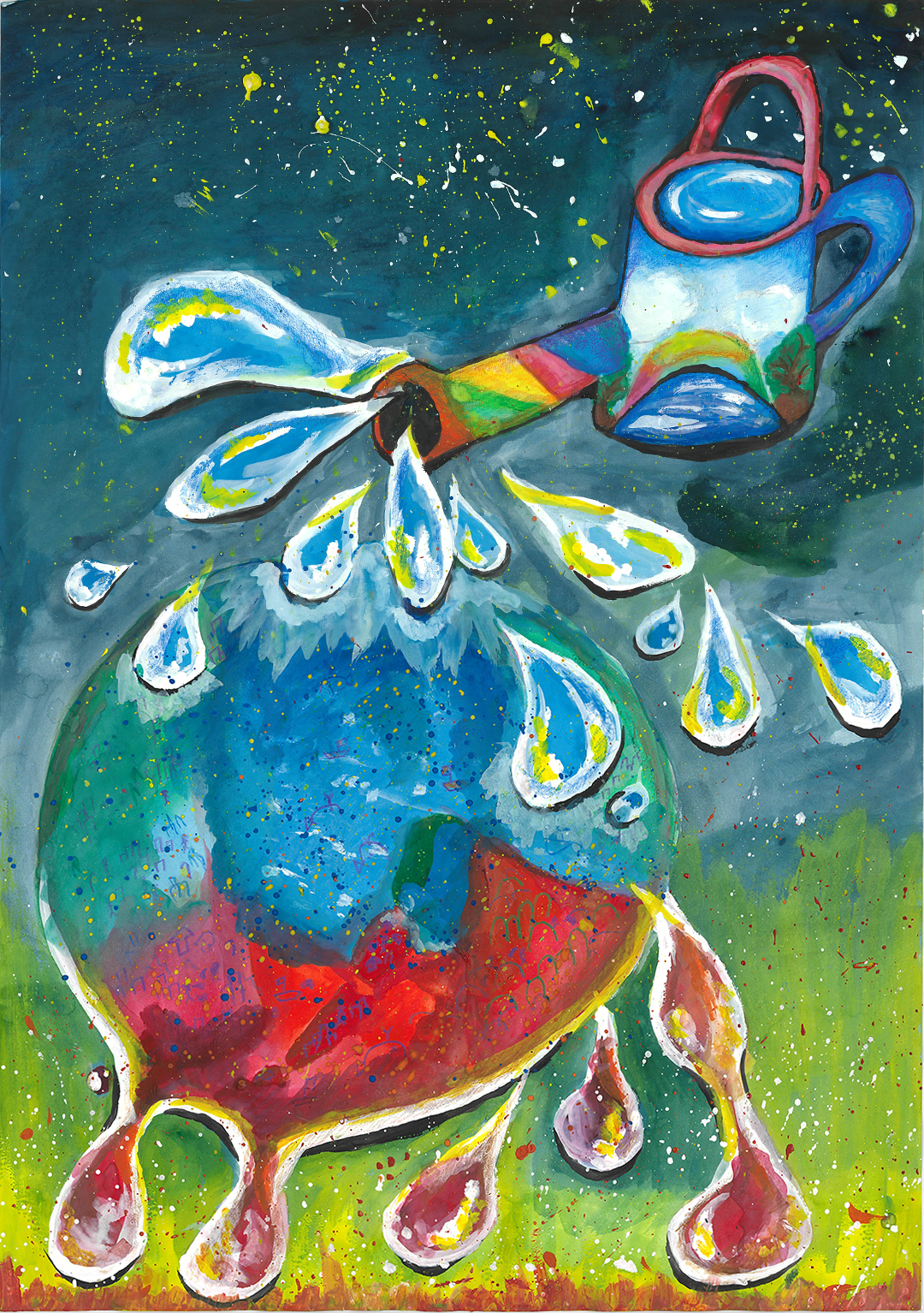 絵の説明:宇宙から暑い地球を冷やすために、じょうろで水をかけています。暑さがわかるように、下から炎を出しています。水に躍動感をもたせるよう、光や影、したたる感じを付けています。絵では全体的に暑さを感じさせるようにしています。