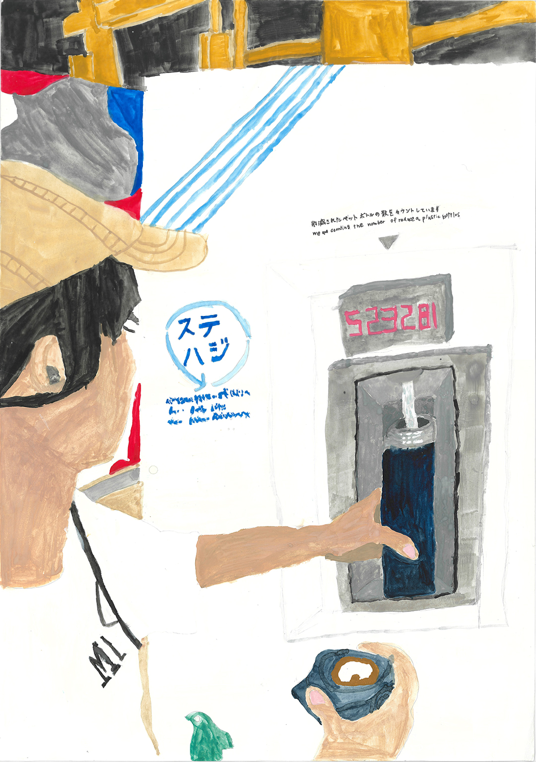 絵の説明:万博に行くとマイボトルに給水ができます。それが、すごいなぁ‥こんなことできるんだ…と思ったのでかくことを決めました。