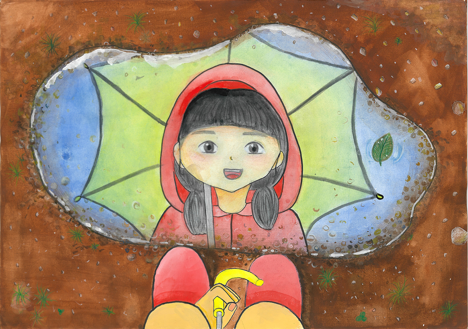 絵の説明:雨あがりの水たまりを、見つめる人を書きました。
