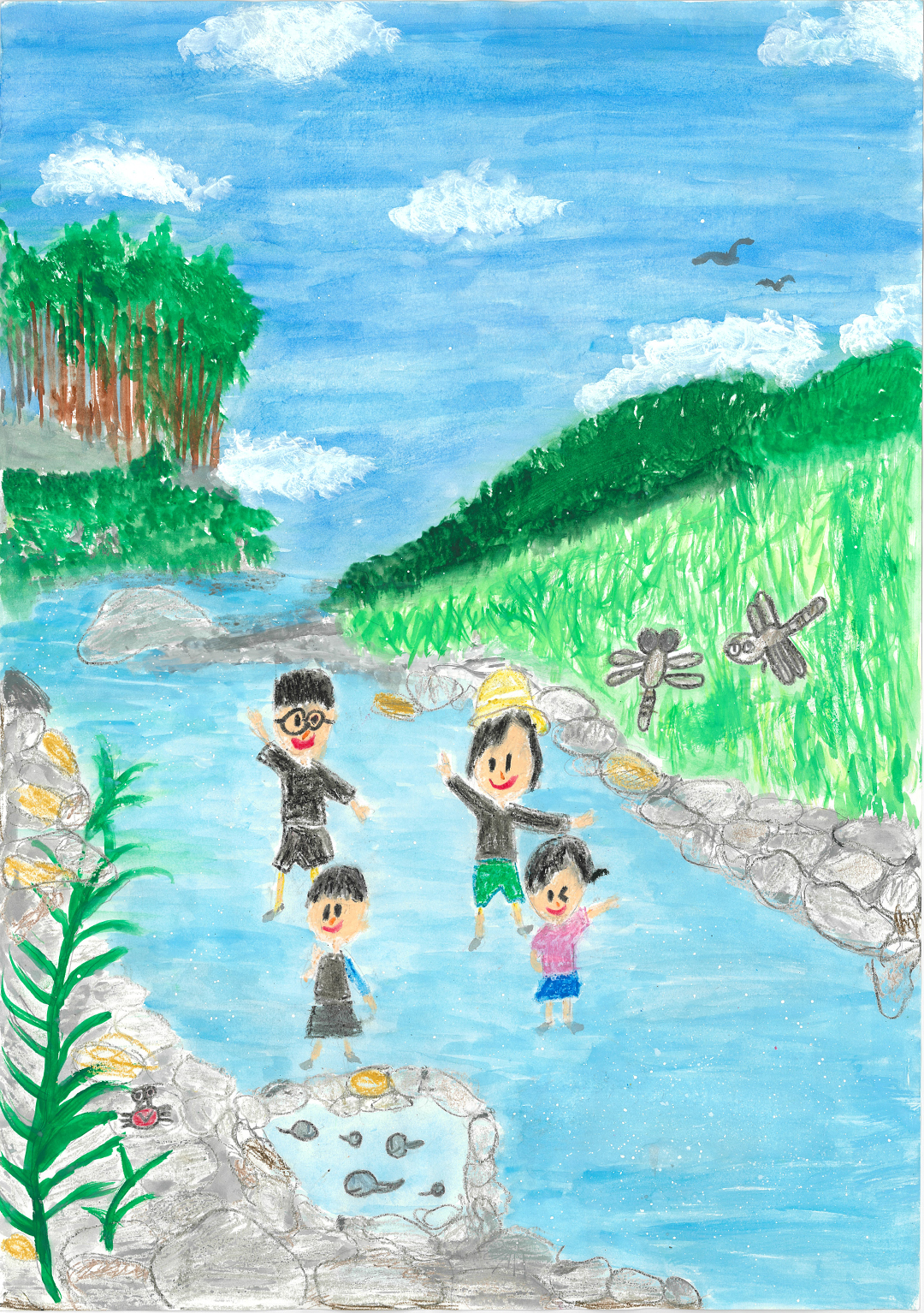 絵の説明:家ぞくで川あそびに行ったとき、おたまじゃくしやかえるをはっ見してとてもたのしかった思い出をかきました。
