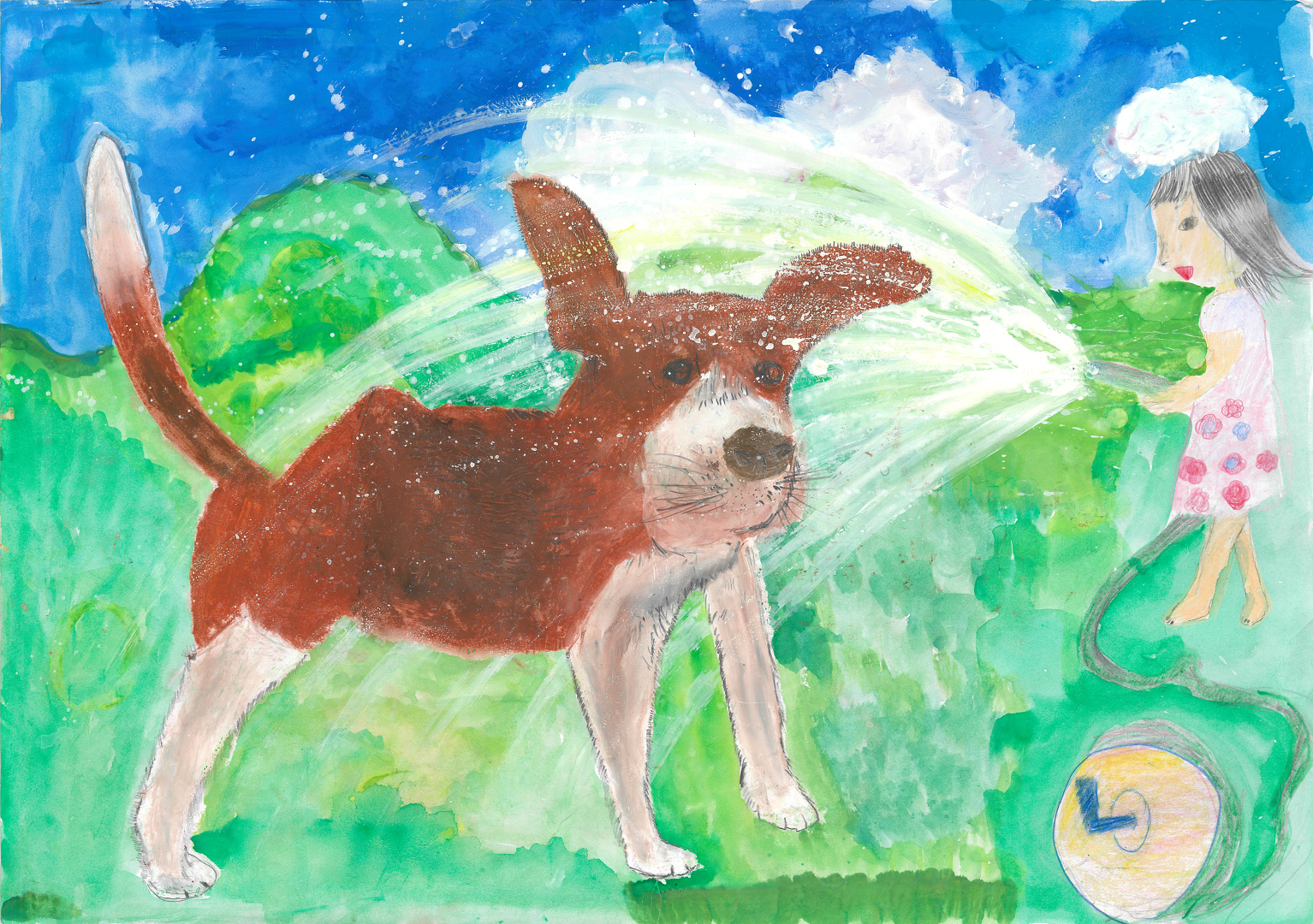 絵の説明:私が夏のあつい日に、おにわで水あそびをすると気もちよくて、私も犬も、えがおになります。