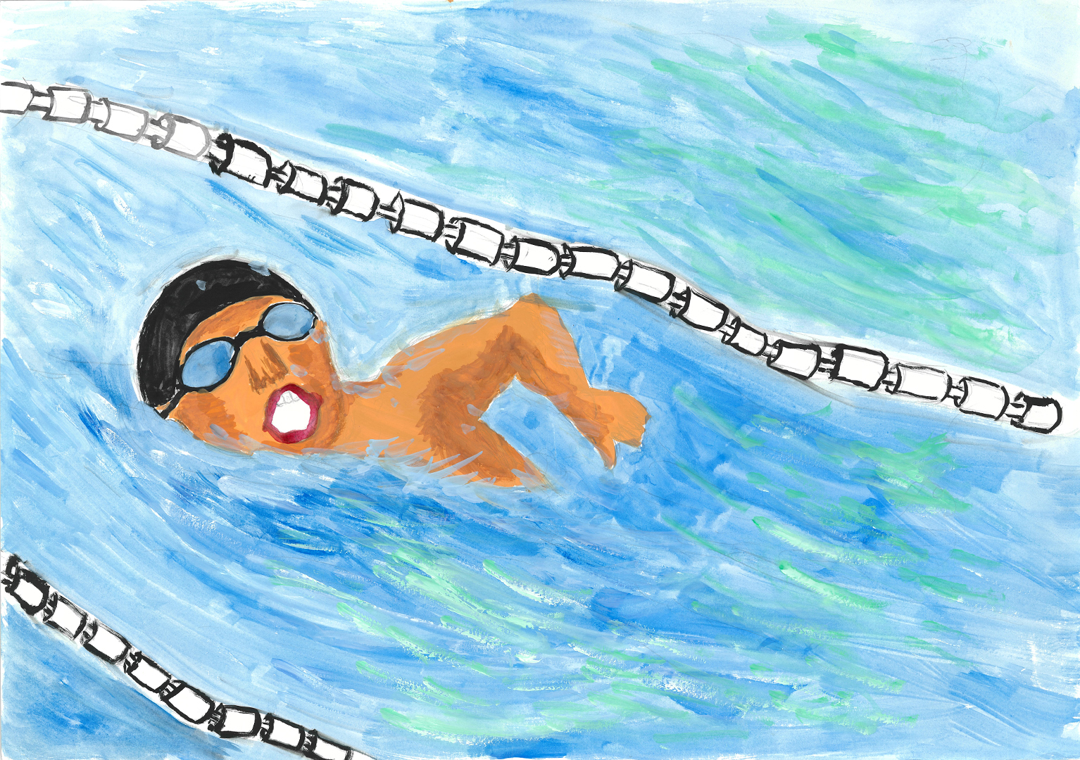 絵の説明:自分の持つベストタイムを出すために一生けん命泳いでいる自分の姿を描きました。