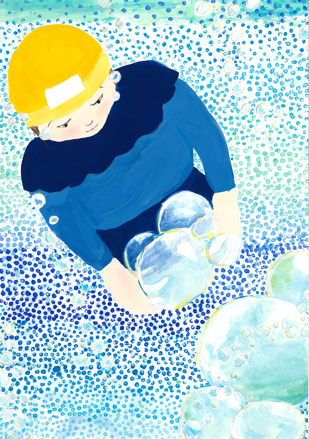 絵の説明:プールの中の泡で遊んでいる私を描きました。背景は綿棒で点を描き、水の美しさを表現しました。
