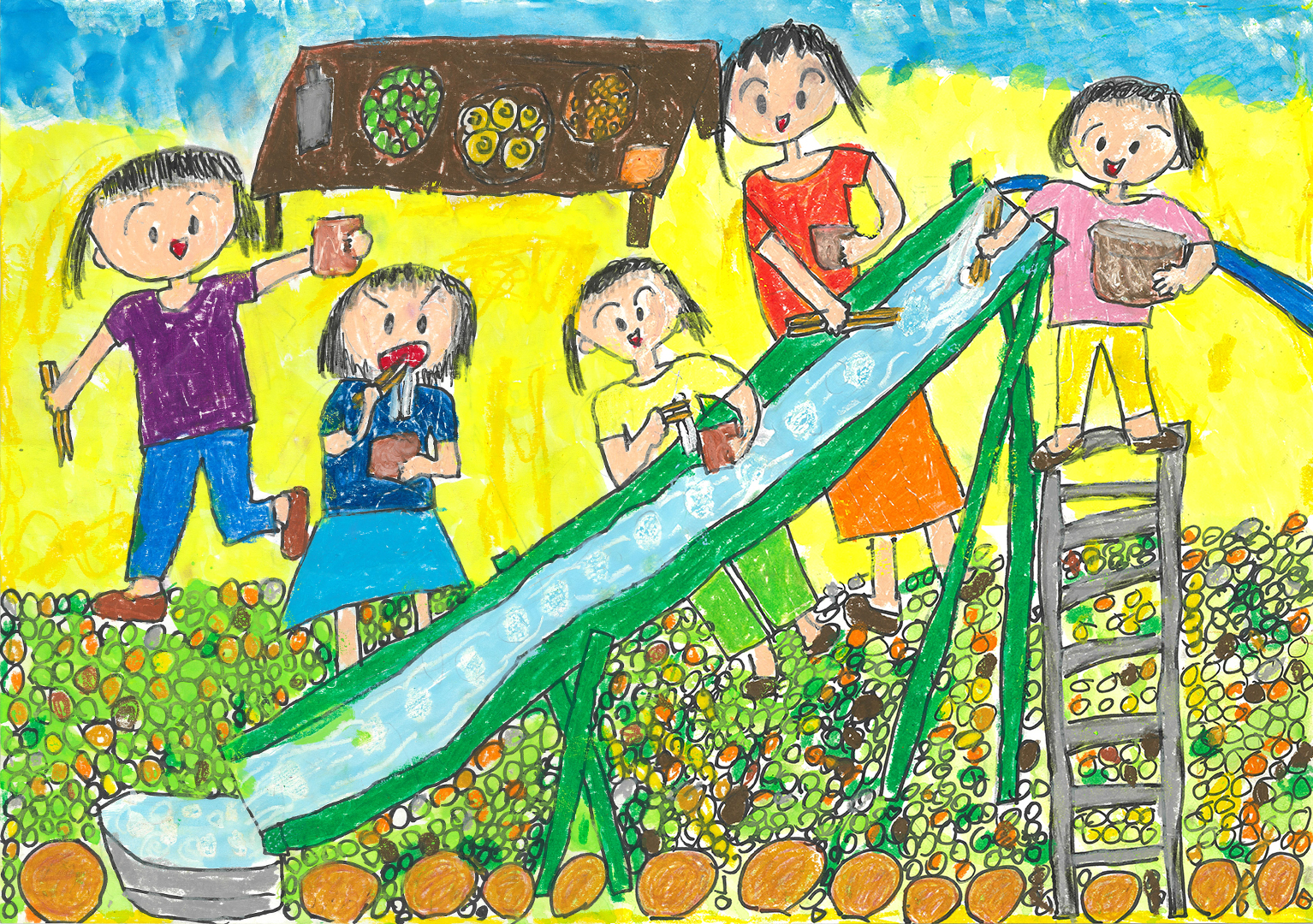 絵の説明:おじいちゃんが取ってきた竹で、流しそうめんをやりました。水といっしょに流れてくるそうめんは、つめたくてきれいでした。おいしかったです。