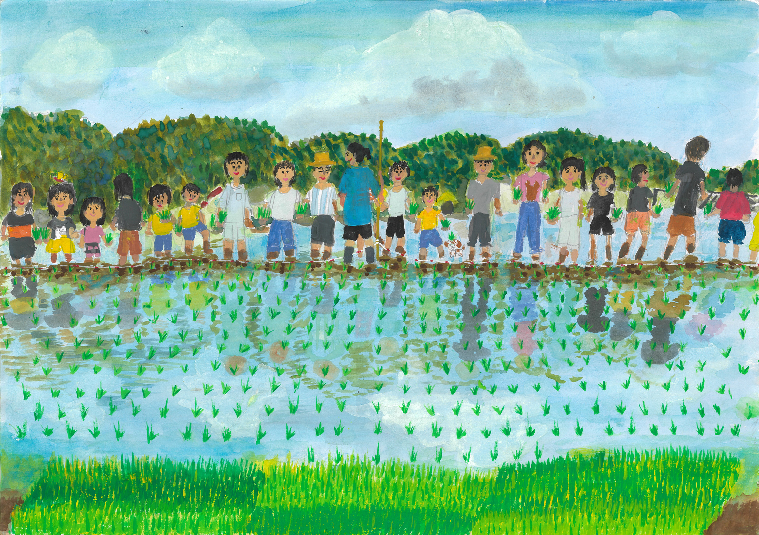 絵の説明:今年もみんなで田植えをしました。人間にとって大切なお米は水の力で育ちます。大きく育ったいねをかるのが楽しみです。私は、おにぎりが大好きです。