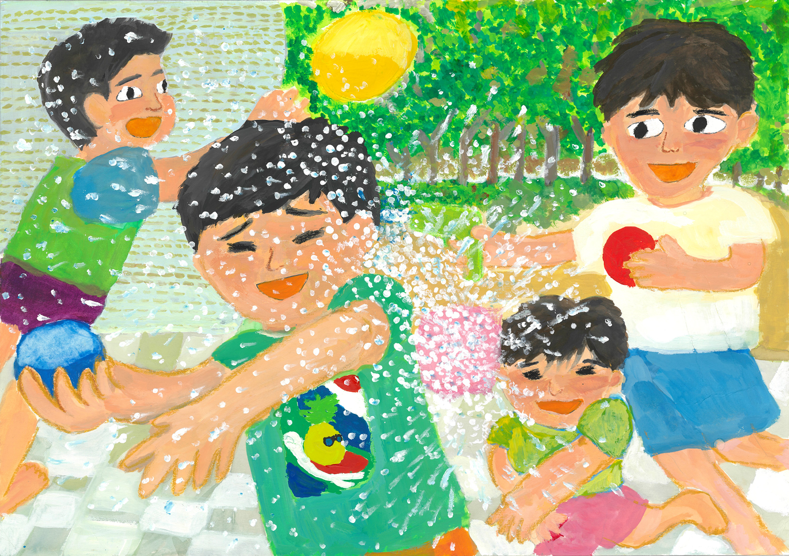 絵の説明:夏休みにいとことお兄ちゃんとで水風船で遊びました。風船が当たると勢いよく水が飛び散るので、気持ちよくて、必死になって遊びました。