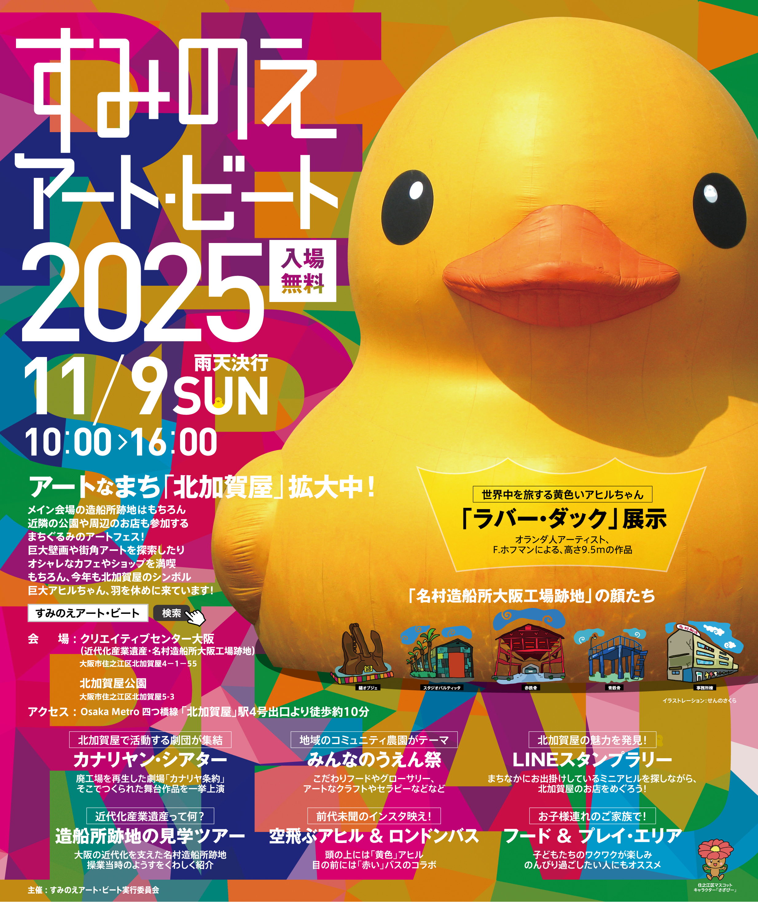 巨大なラバー・ダックの展示や、演劇の上演、アーティストの作品展覧会に加え、食・農・アートのマルシェ「北加賀屋みんなのうえん祭」、子どもから大人まで楽しめるフード&キッズ・エリアなどをお楽しみいただける「すみのえアート・ビート2025」を開催いたします。