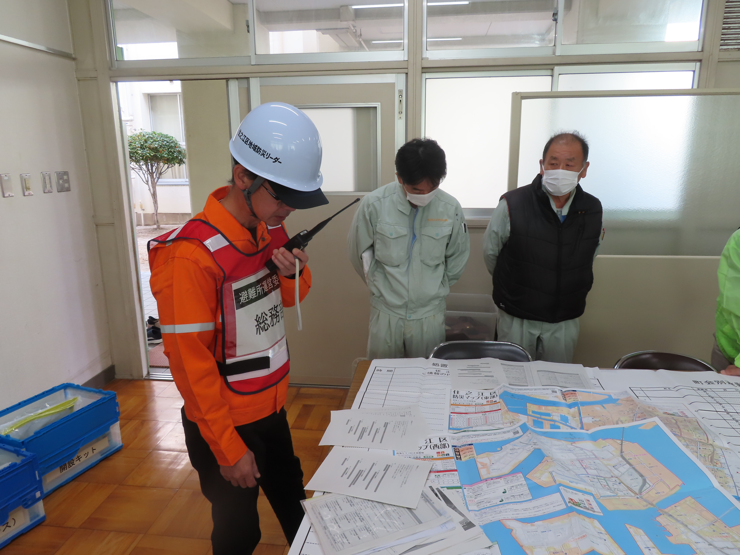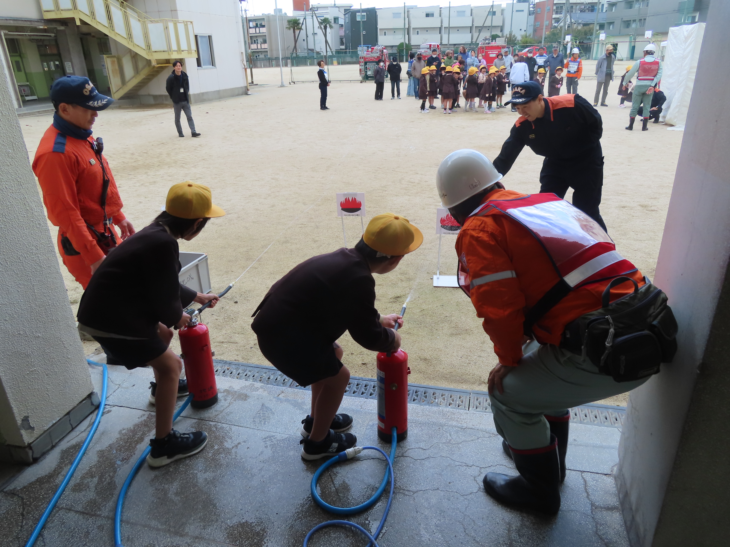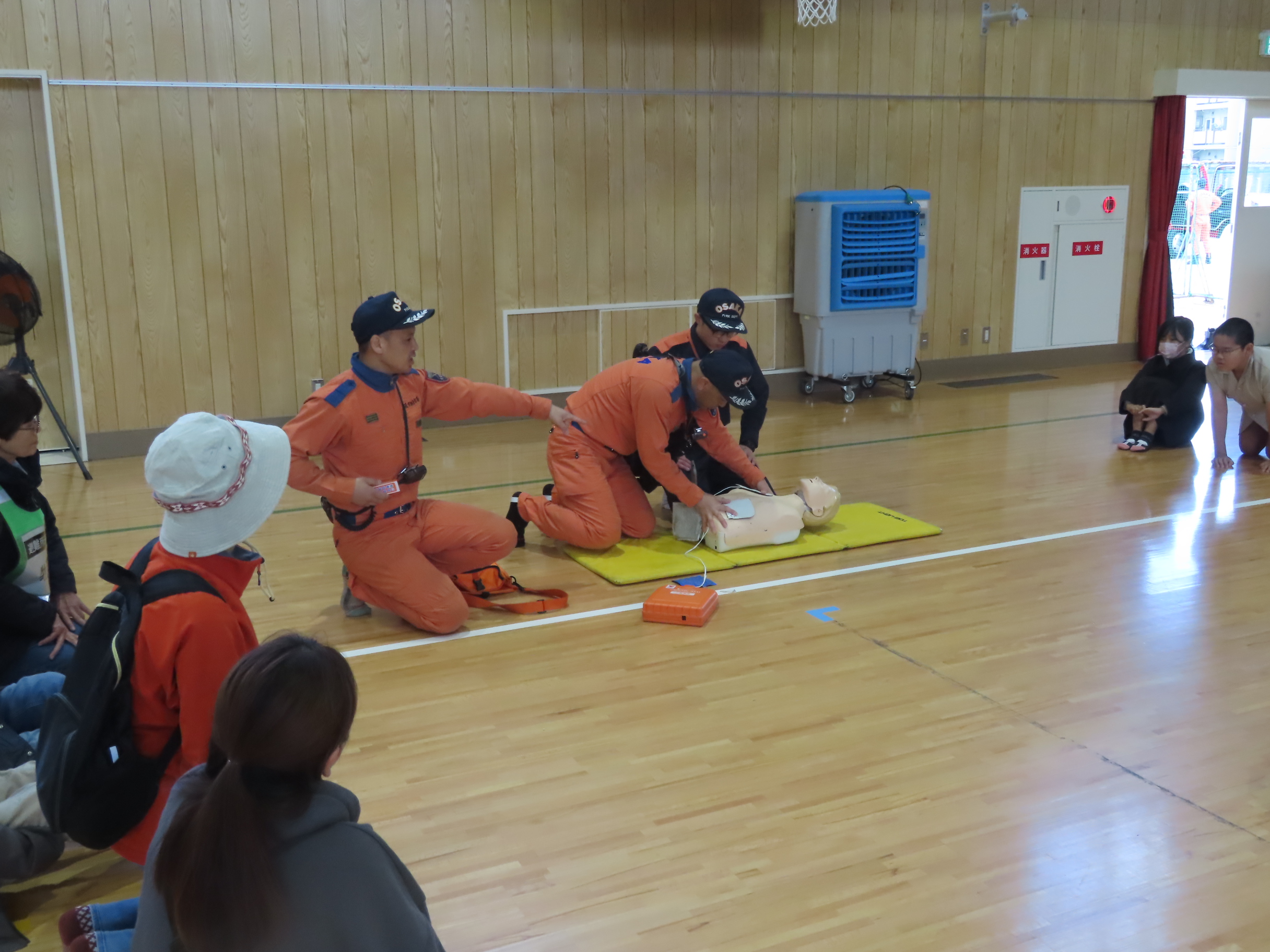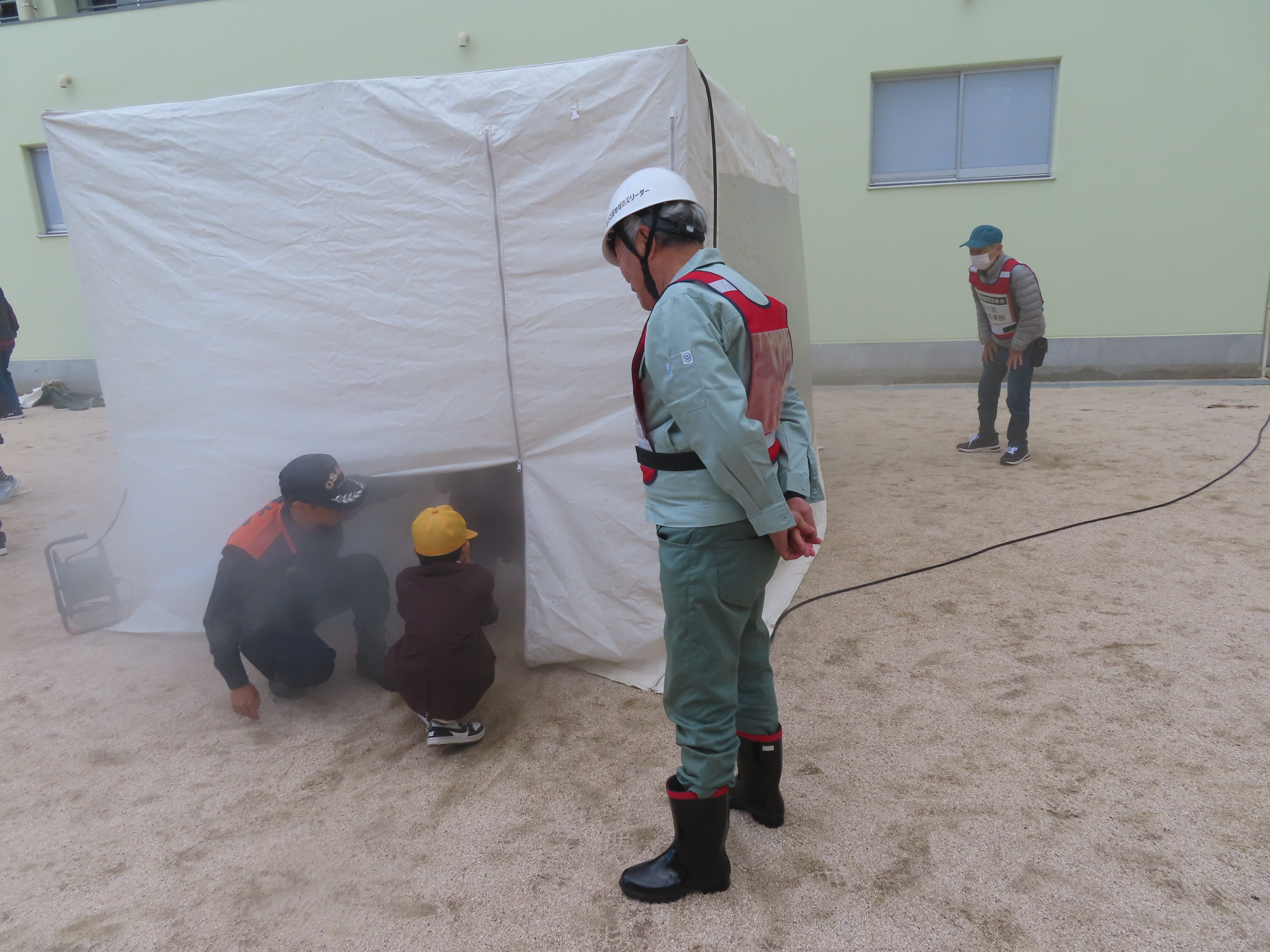 加賀屋地域と加賀屋小学校の防災訓練として、講演、避難所開設・運営訓練及び消防訓練等を実施。