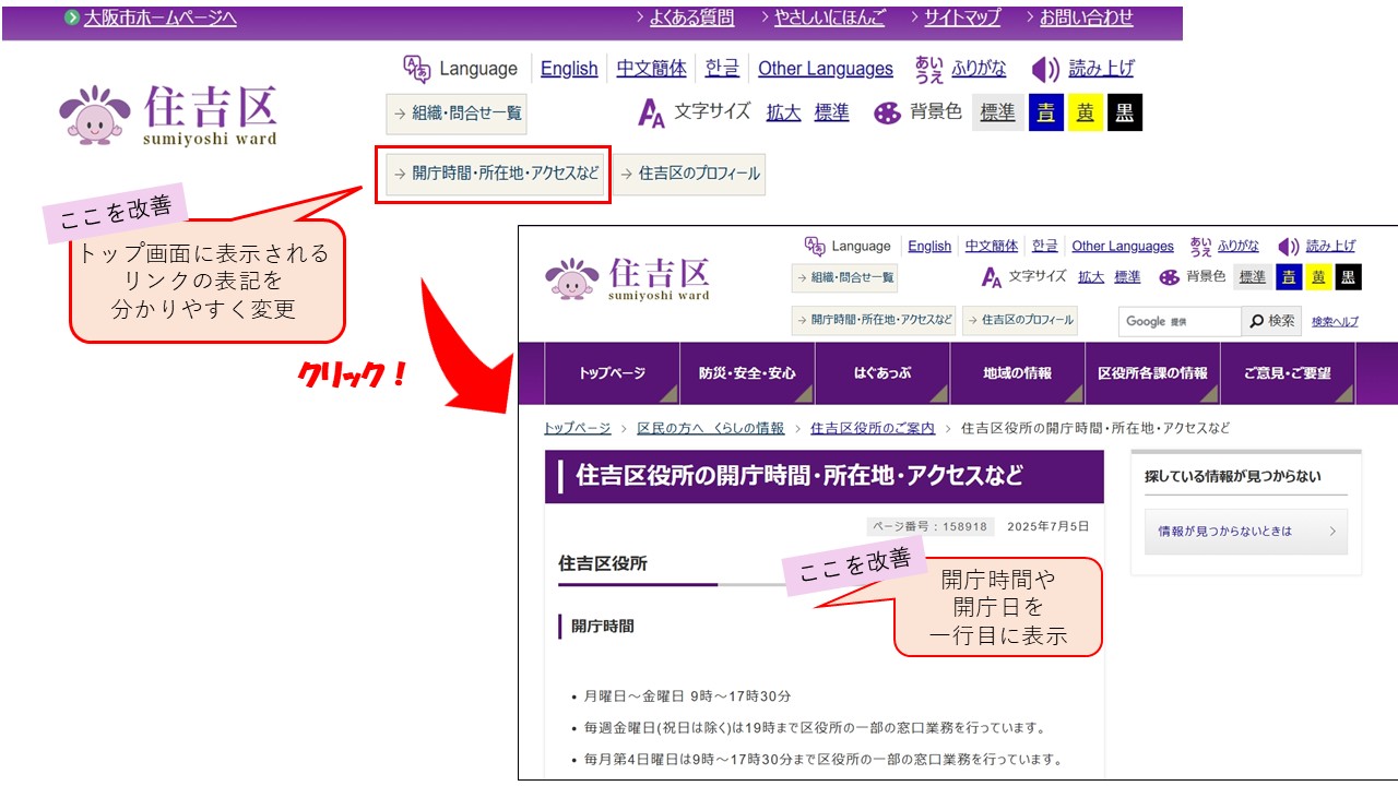 ホームページのトップ画面に表示されるリンクの表記を分かりやすく変更しました。 また、リンクを開くと開庁時間や開庁日が一行目に表示されるよう、掲載内容を改善しました。