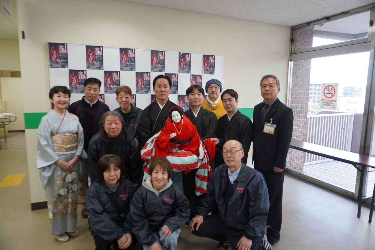 公演終了後、希望者の方々が文楽人形「お七」と「お七」の主遣いの桐竹紋秀さんや解説役の桐竹勘次郎さん、足を遣っていた桐竹勘昇さんと記念撮影を行いました。